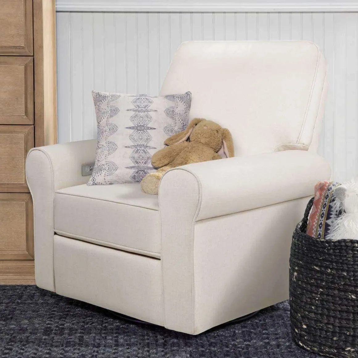 The Monroe Pillowback Power Recliner introduces traditional style with all the comforts of modern technology. With plush arm rests and a soft pillowback, it provides a restful retreat through day and night. With the Monroe’s electronic reclining mechanism, built-in USB port, and gentle swivel and gliding motions, you and your baby can relax with comfort and ease.