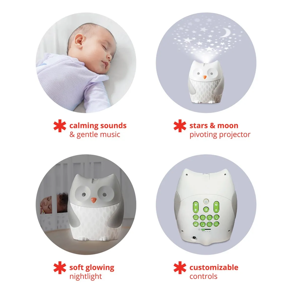 With plug-in power, our décor-driven friend offers multiple ways to soothe baby, including music, lights and projection. Featuring a dimmable nightlight that emits a warm glow, our baby soother plays eight gentle melodies and calming nature sounds. An adjustable pivot lens projects a starry nightscape onto any surface so little one can see the luminous sky from his or her favorite sleeping position. Just choose the light and sound combination that’s right for your baby and our sweet friend will do the rest!