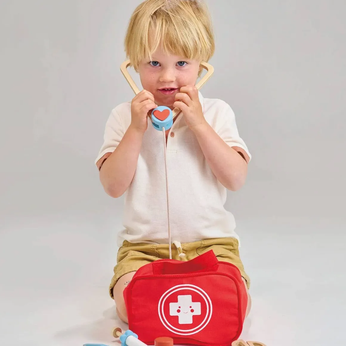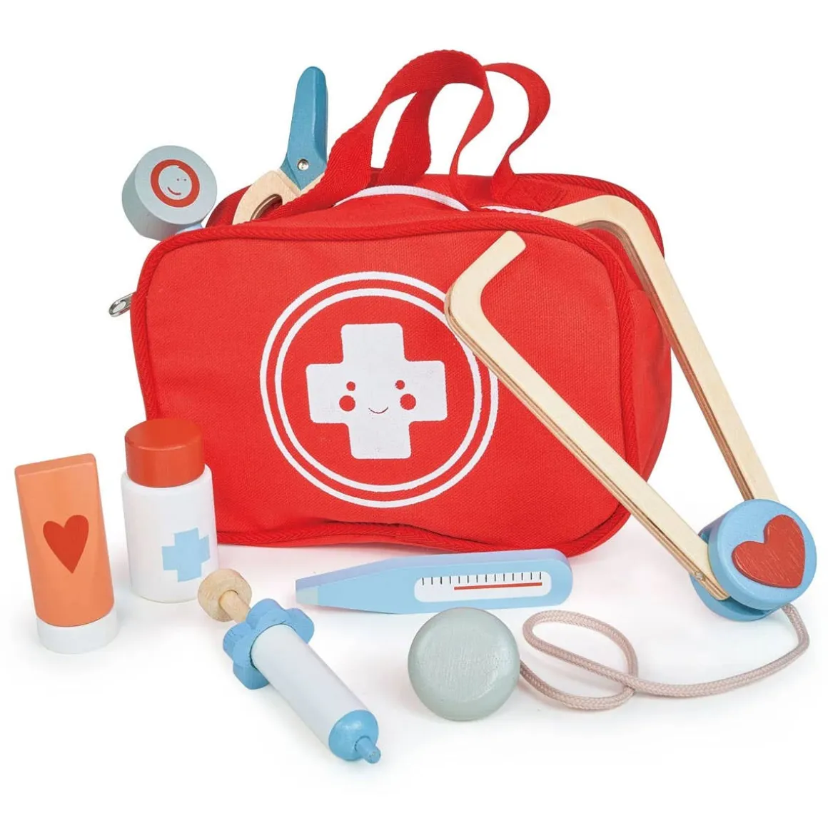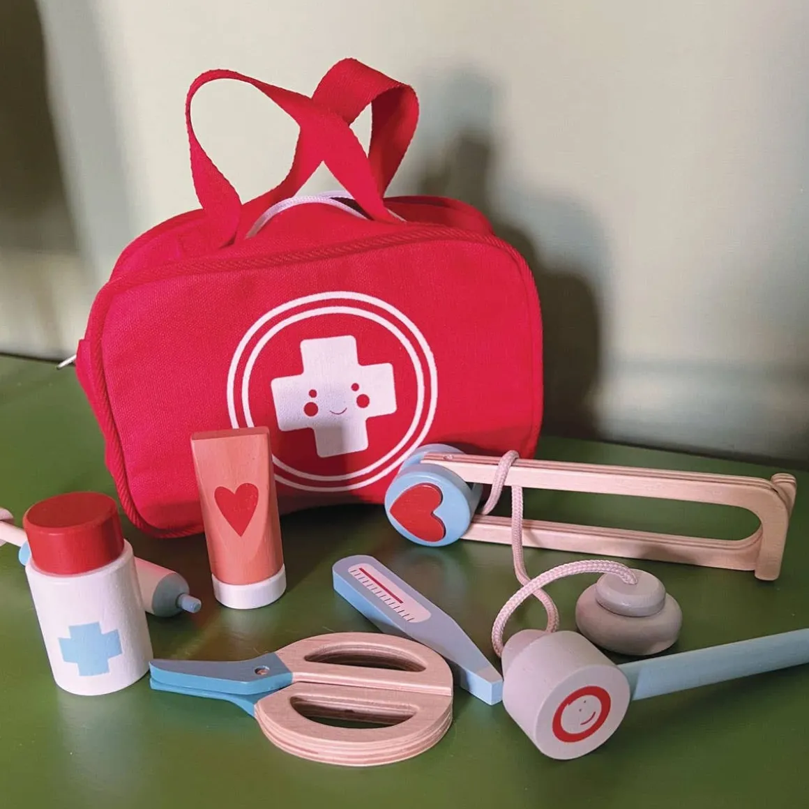 This wooden toy doctors bag set contains a pretend stethoscope, thermometer, ear probe, scissors, tube of cream, syringe, bottle of pills, all contained in a bright red printed canvas bag with zip and handles.