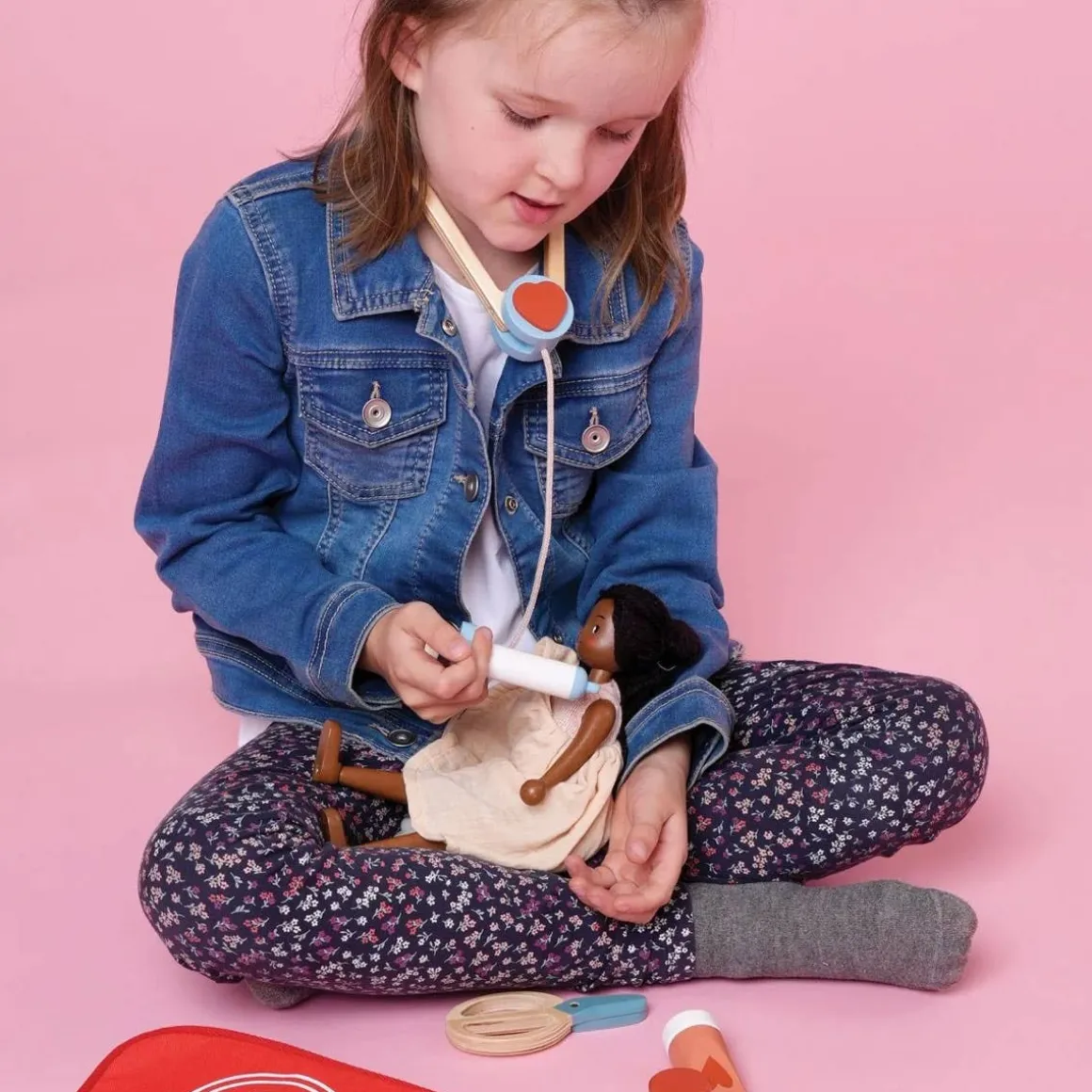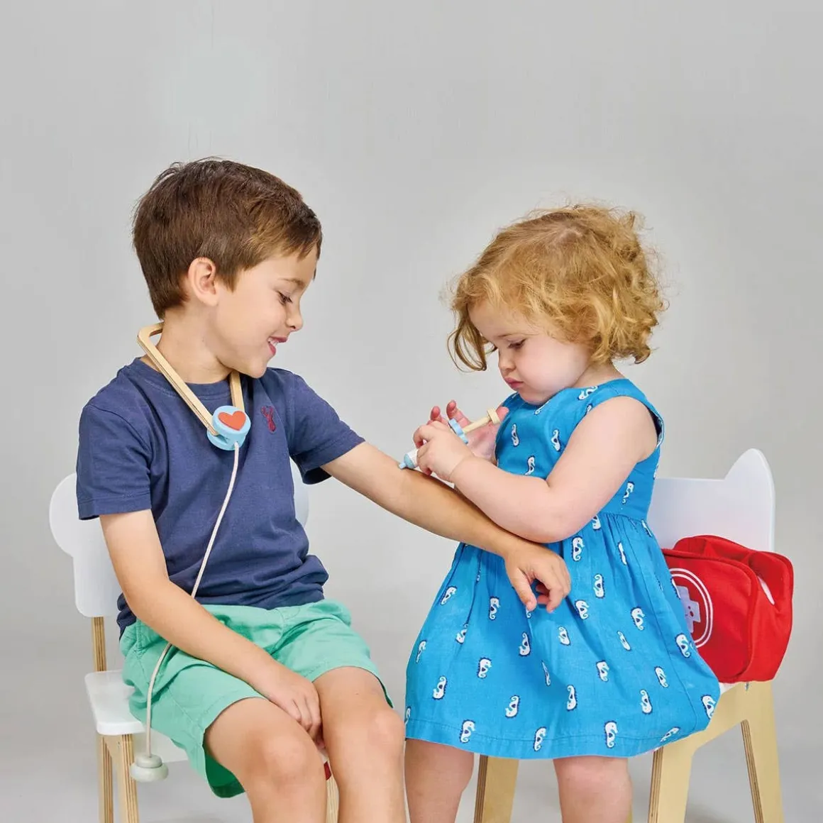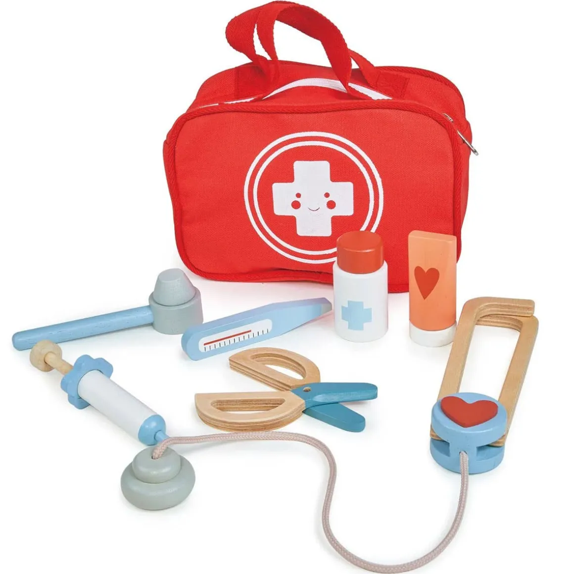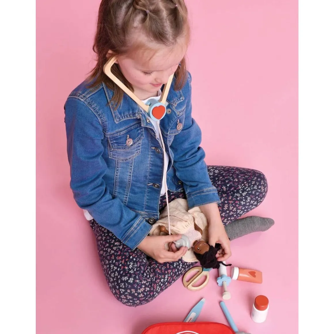 This wooden toy doctors bag set contains a pretend stethoscope, thermometer, ear probe, scissors, tube of cream, syringe, bottle of pills, all contained in a bright red printed canvas bag with zip and handles.