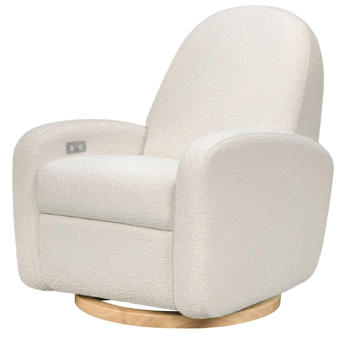 The Nami Glider Recliner is an elevated nursery accent piece that’s both playful and comfortable with its round and friendly silhouette. The oversized, organic proportions, coupled with its natural wood base, fit into a soft and modern palette. Rest and recharge in this recliner with its built-in USB port, smooth swivel motion, and effortless back and forth gliding. Lean back and relax at the touch of a button with this recliner’s quiet electronic control button. Pair with Naka or Enoki Storage Ottoman to complete the look.