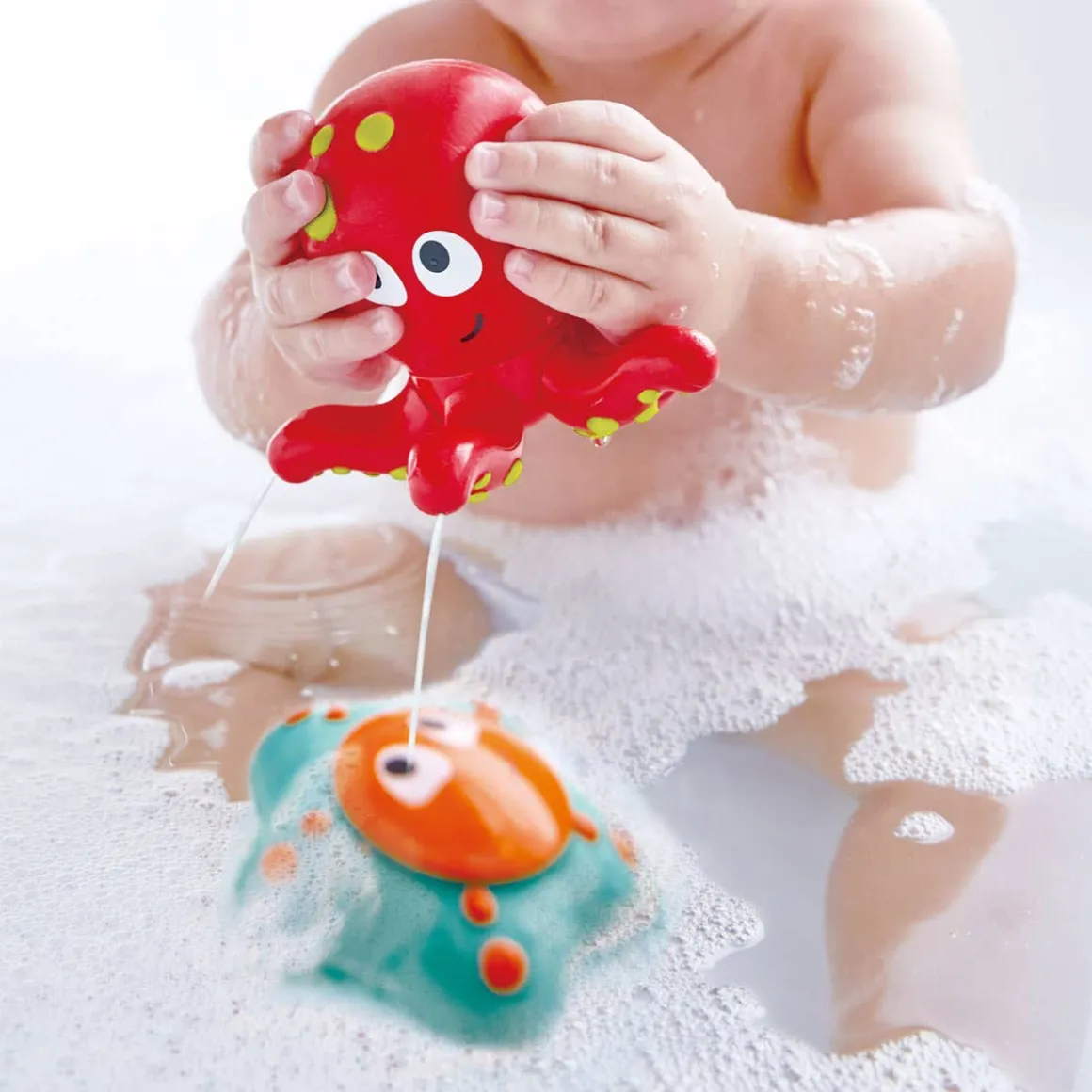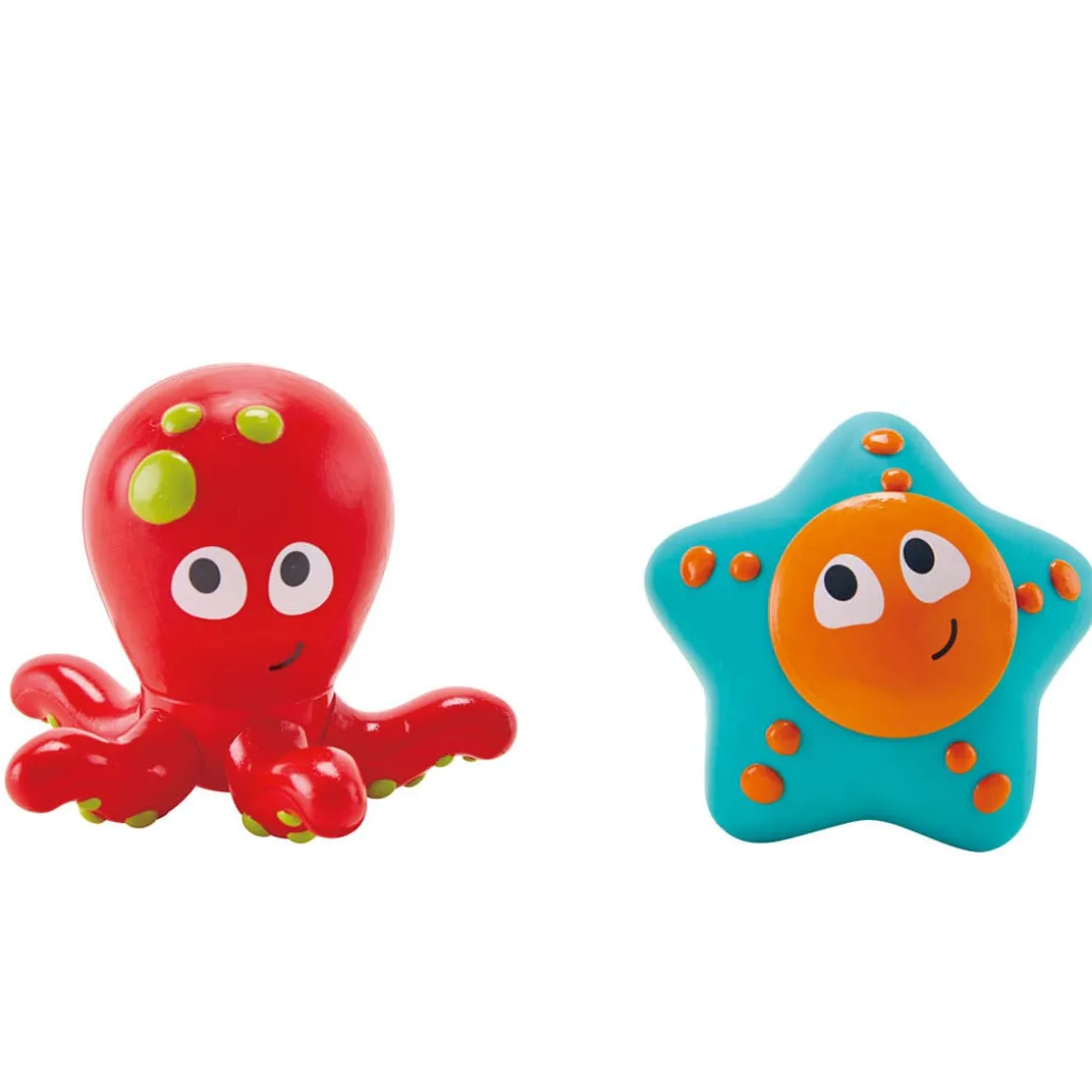 This cute octopus and starfish have a cheeky secret! If you fill them up with water and squeeze them they will shoot out water. Brings splashy fun to bath time!