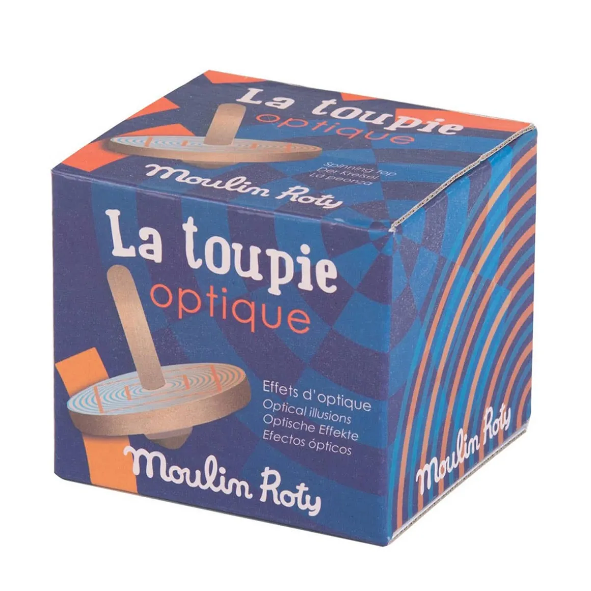 5 optical illustions to place on a wooden spinning top, supplied in vintage-look presentation box. Measures approx 7cm tall The reverse side of each optical disc is blank allowing you to create your own patterns to study it’s optical effect.