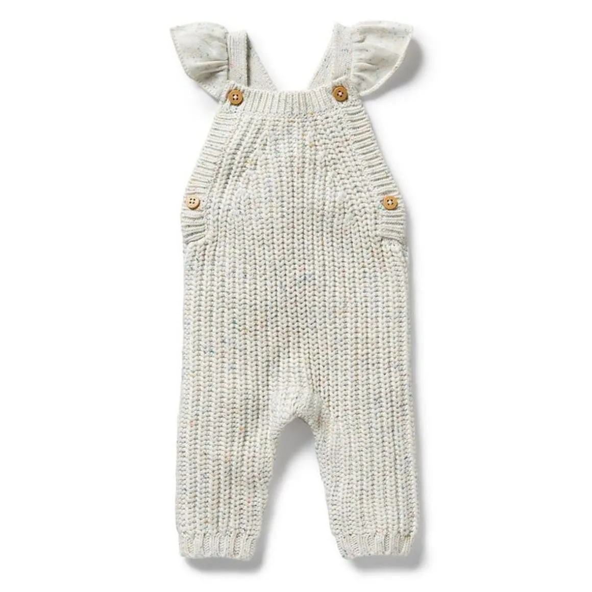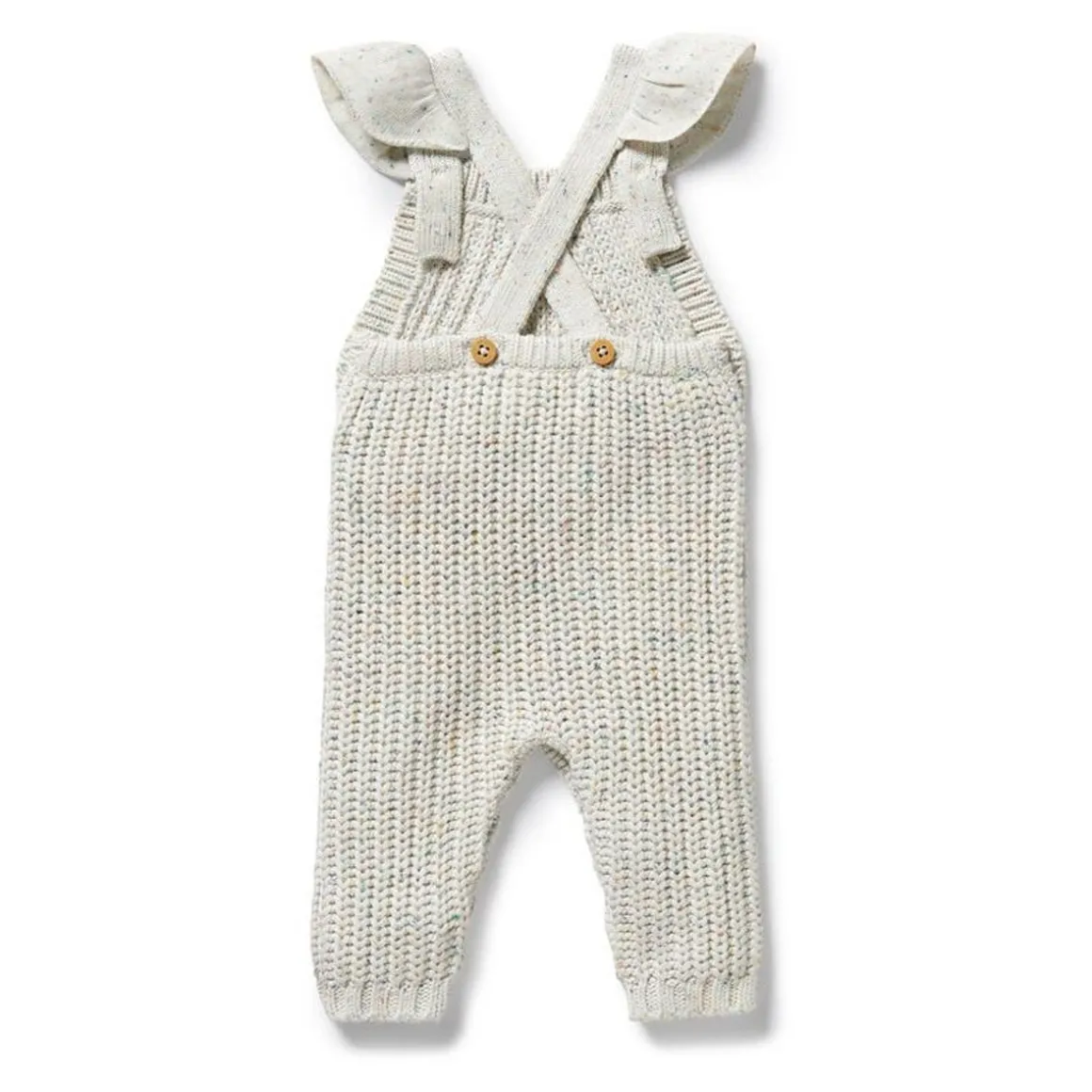 This full length knit overall with ruffle, features button up shoulder straps and a snap leg opening for quick and easy nappy changes. Made from a beautiful blend of cotton, bamboo and wool it’s a style you’ll want in every colour. Pair back with an organic long sleeve top for an adorable winter layered look.