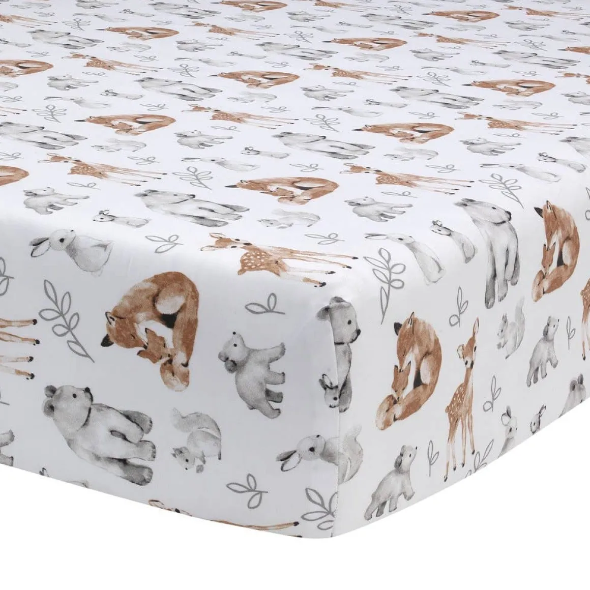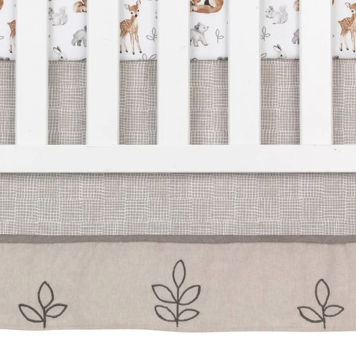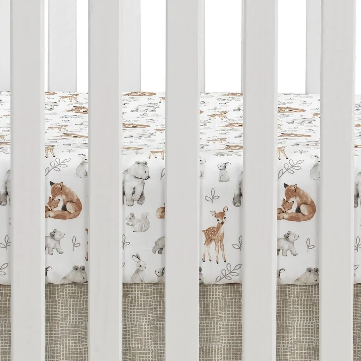Welcome your little one home with a charming nursery filled with friendly forest water colored painted animals. Mommy and baby bears, foxes, and bunnies lovingly interact with each other. A delicate deer and a happy little squirrel join in the fun. The four-piece set includes one quilt, one 100% cotton fitted crib sheet, one crib skirt and one wearable blanket. Beautiful textured fringe, embroidered leaves and a modern chevron border decorate this adorable 100% cotton sateen bedding set. An embroidered leaf design is featured on the front of the crib skirt and the cotton fitted crib sheet features sweet watercolor forest animals. Included in the bedding set is a 100% cotton wearable blanket with a little furry white bear on the front corner next to baby’s heart. It fits a 10 to 18 pound baby and is recommended for safe sleep.