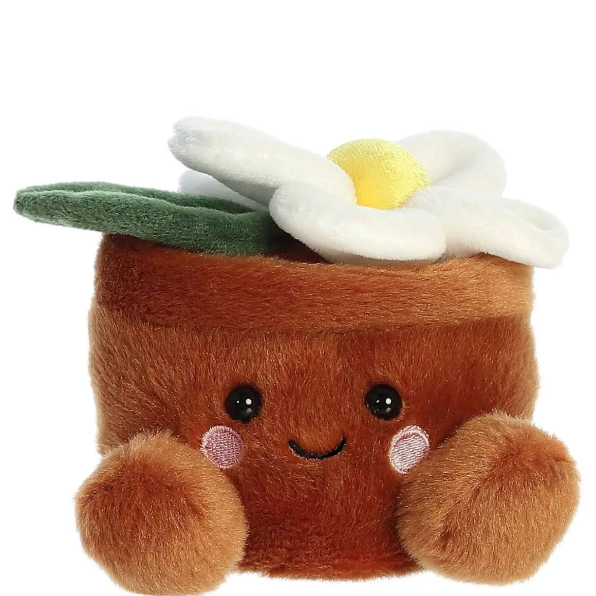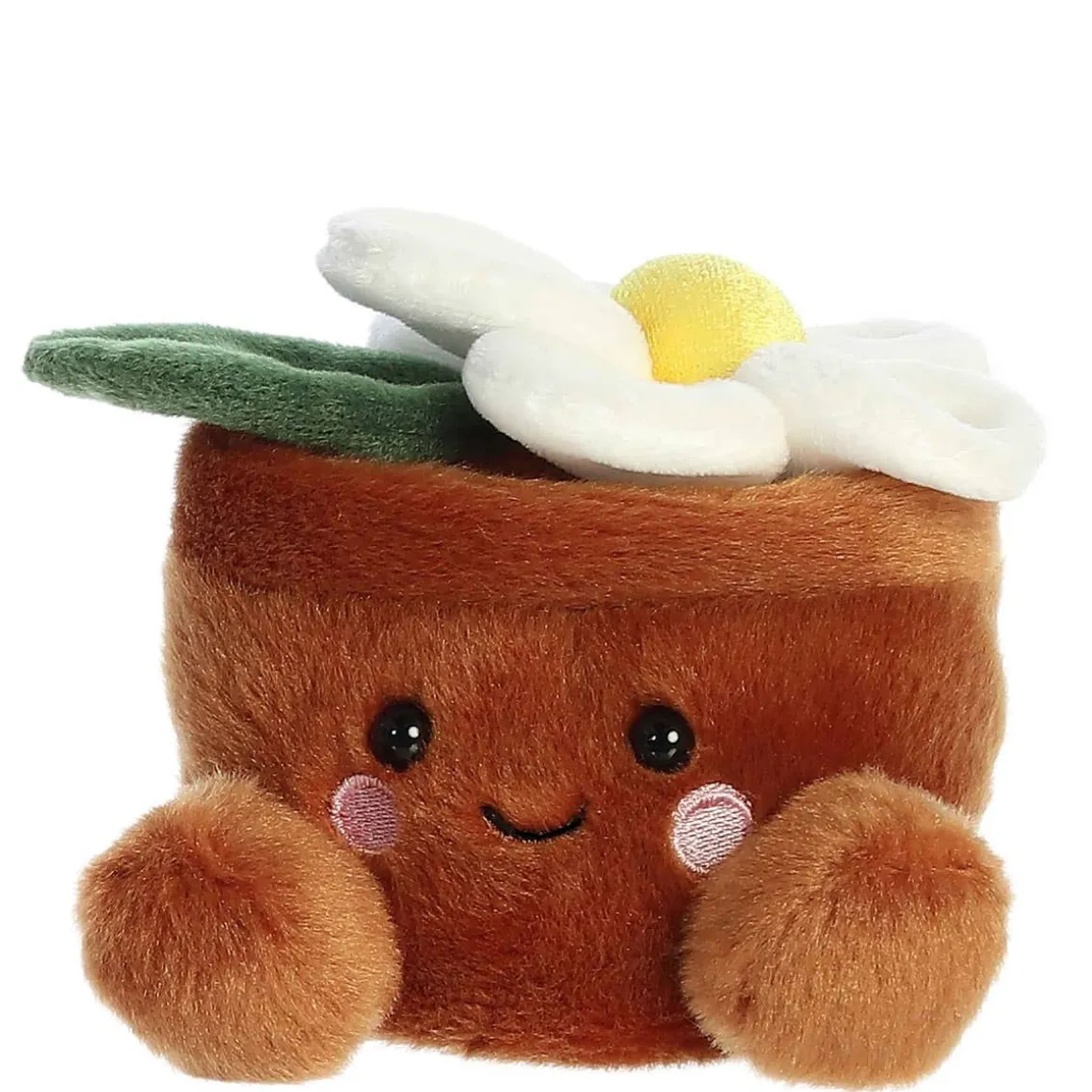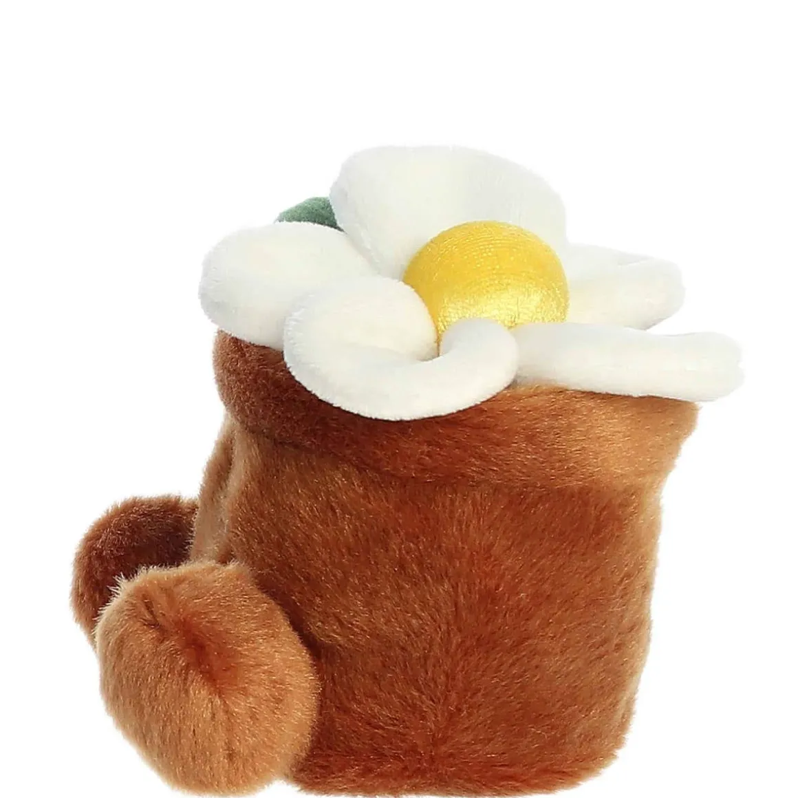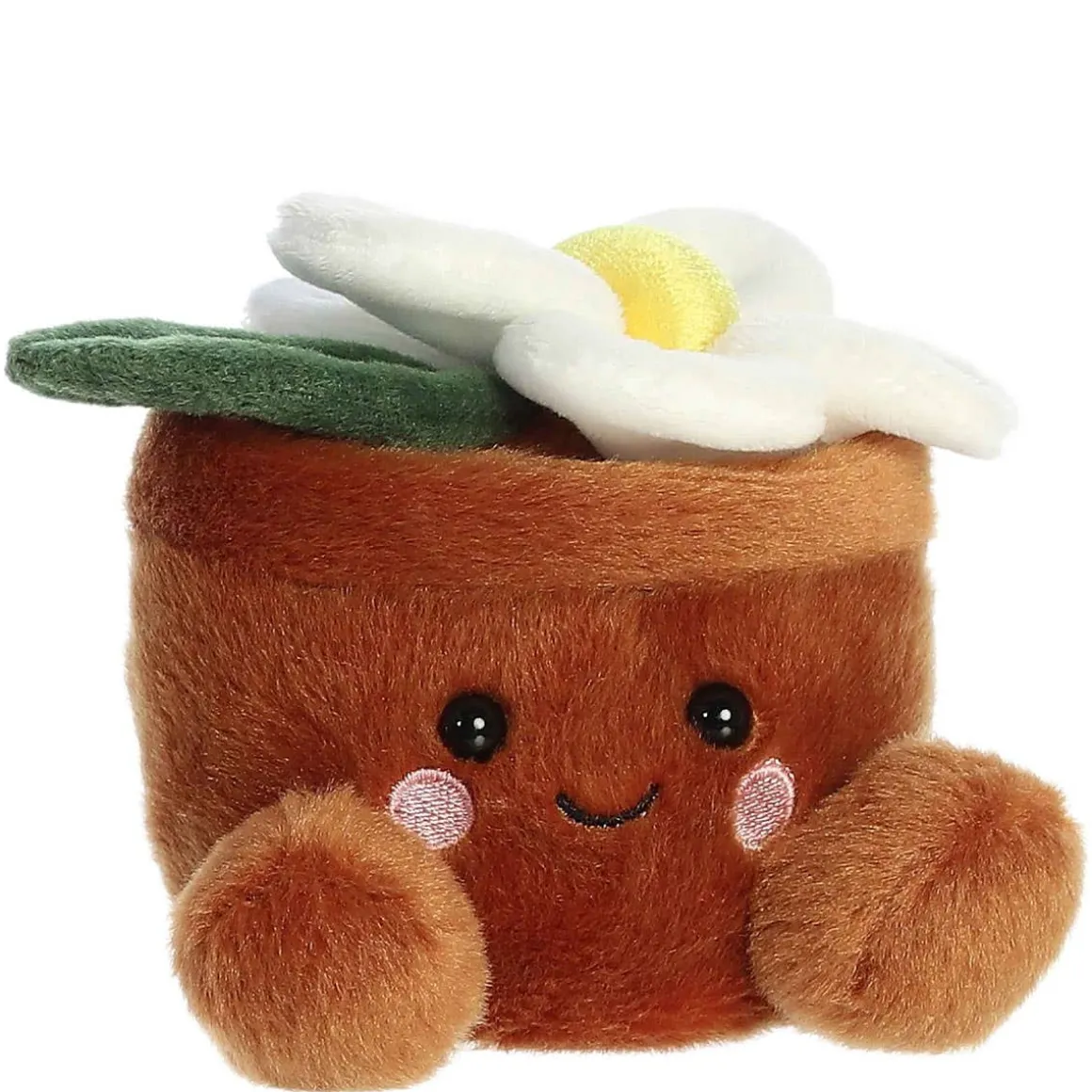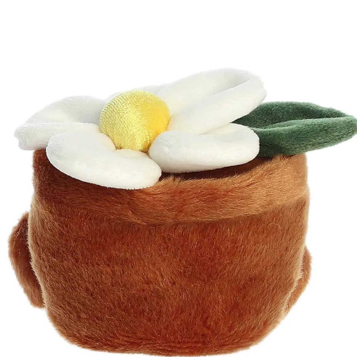 Junie Daisy is a plush toy resembling a cheerful daisy in a pot. The body is a warm terra cotta color, topped with a white daisy with a sunny yellow center and a green leaf!