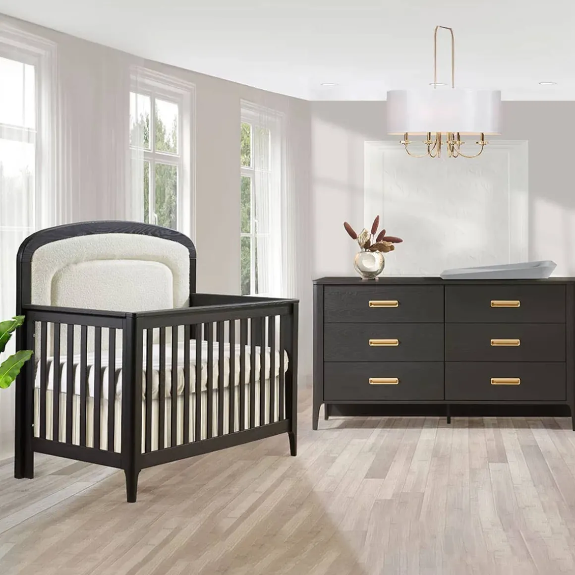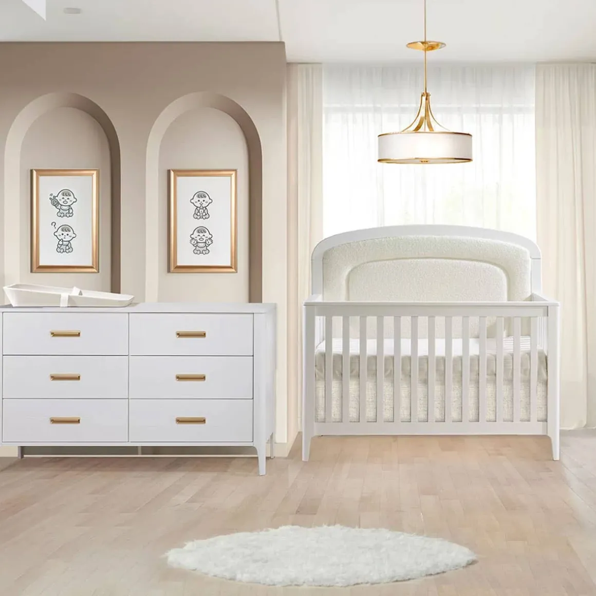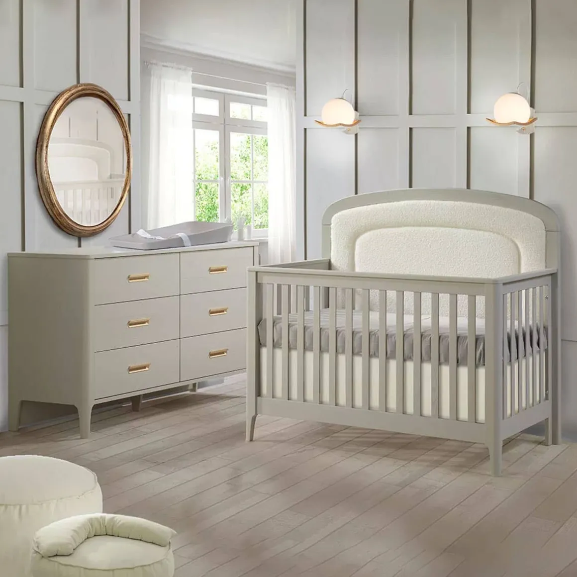 The Palo collection revisits the Mid-century style. The Convertible crib is designed with a uniquely curved headboard with upholstered Bouclé panel and rounded posts. The larger dresser & chest with rounded tops and posts are equipped with luxurious semi encased rounded handles from Italy.