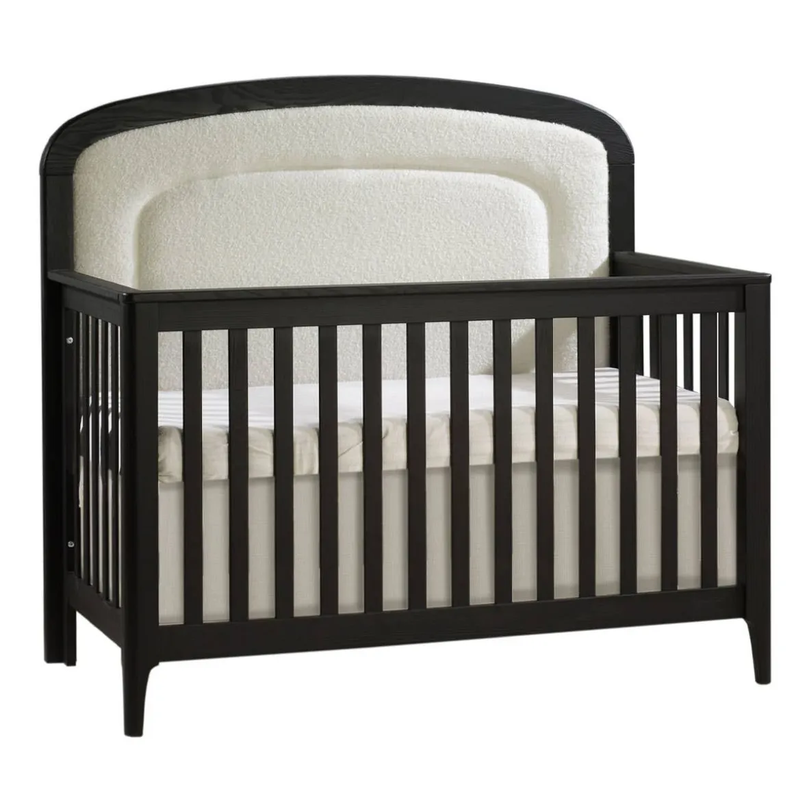- Convertible crib designed with a uniquely curved headboard and an upholstered headboard panel which is buttonless for extra safety – No Choking hazards!
