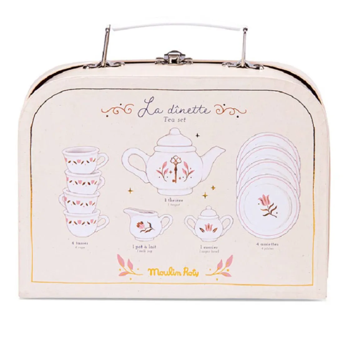 China tea set decorated with delicate pink and golden motifs, displayed in a delightful illustrated box to serve tea to her mother and her little mouse friends. Contains 1 teapot, 4 cups and 4 saucers, 1 milk jug and 1 sugar bowl. Wash with a soft and damp cloth.