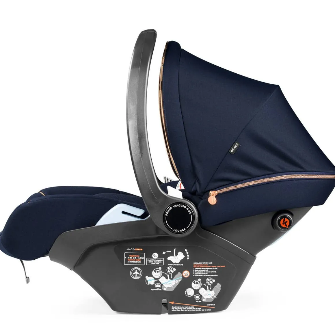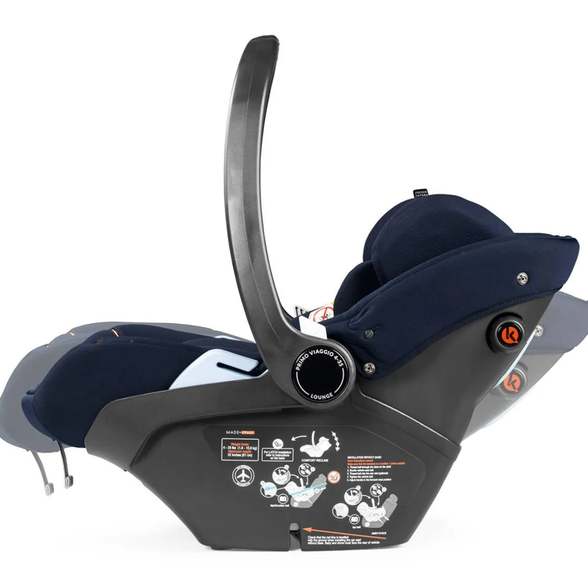 The Peg Perego Primo Viaggio 4-35 Lounge Infant Car Seat features the Comfort Recline function: the backrest reclines and the leg rest extends, allowing the child to lie down in the best ergonomic position when used on a stroller. The extendable Pagoda Hood provides full coverage, shielding baby from outside elements.