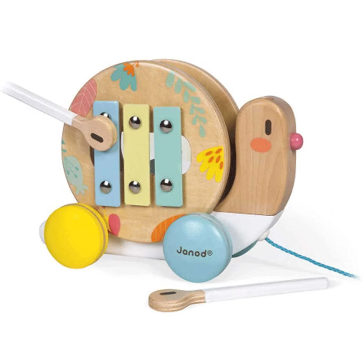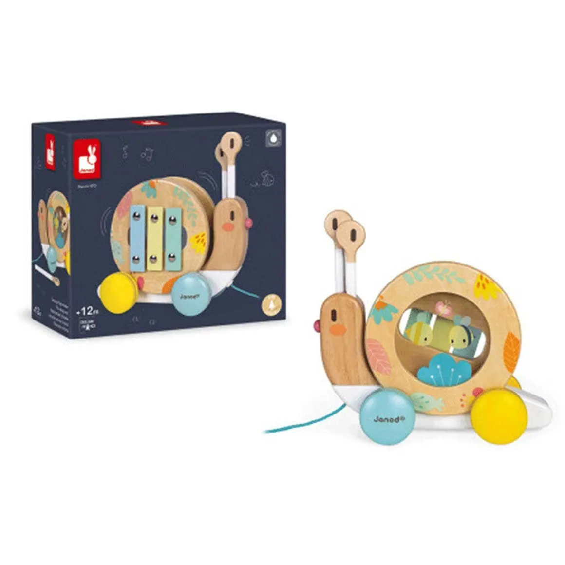 This wooden snail to pull-along is very funny! The shell turns when you walk it and is removable to reveal a tambourine and a small xylophone! The antennas of the snail are also removable and form the rods. A nice companion in very soft and very modern tones that will awaken your child to music in a ludic way!
