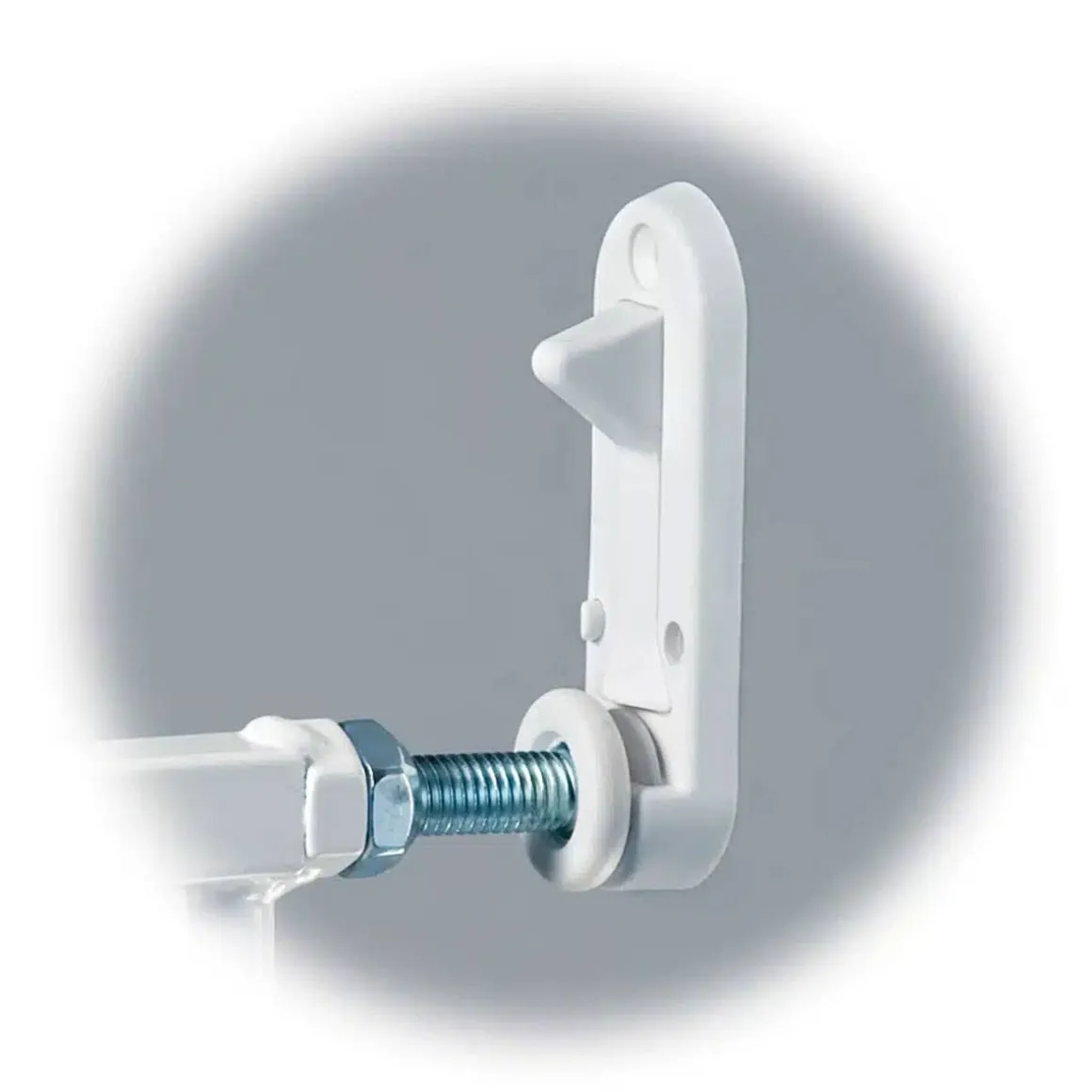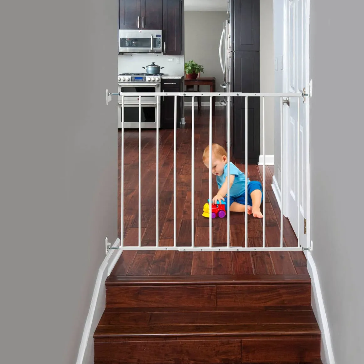 The KidCo® Quick Install Safeway® baby safety gate is specifically designed for top of stairs use, but can also be used in hallways or as a room divider. Provides maximum safety at the top of stairs and in high traffic doorways. Features include stop pin to prevent gate from swinging over open stairs, quick release hardware and a mounting template for safe installation.