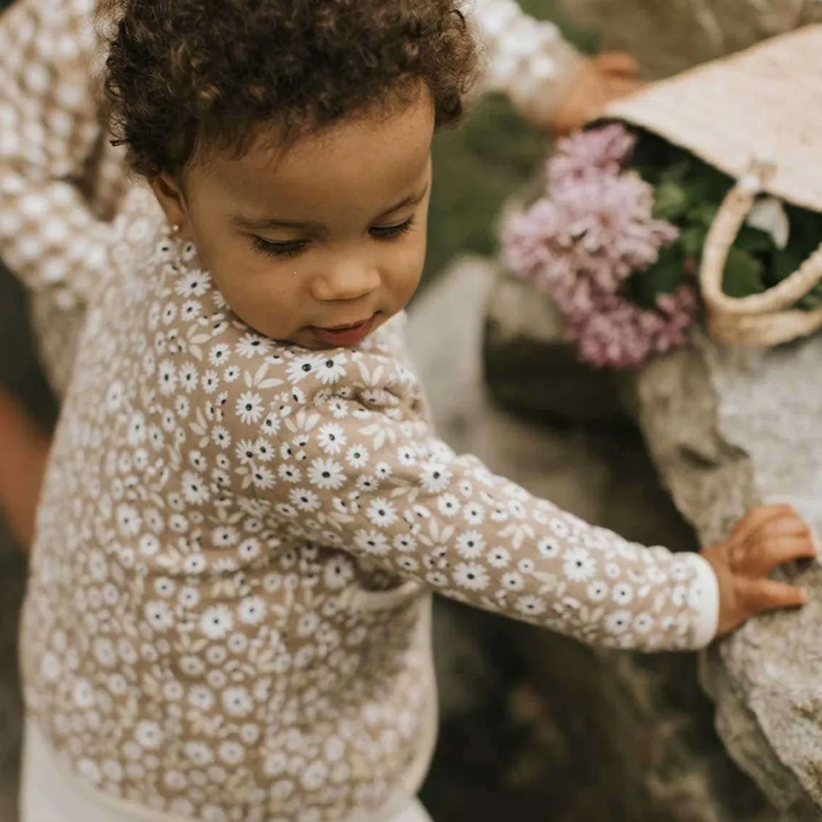 A cozy extra layer for cooler days, this quilted cardigan has a pretty daisy print and white hems for a chic style. Made with organically grown cotton, it’s lightweight yet warm and offers the flexibility growing adventurers need. The structured piece has buttons down the front and is perfect for layering over outfits from the same collection.