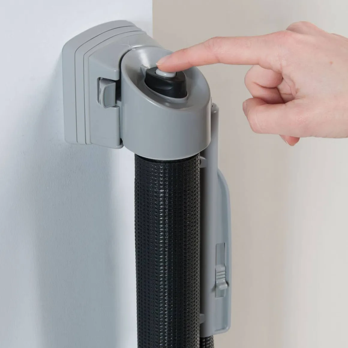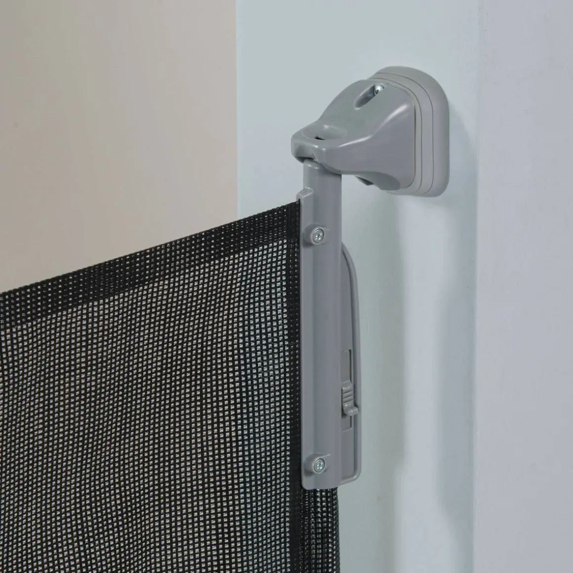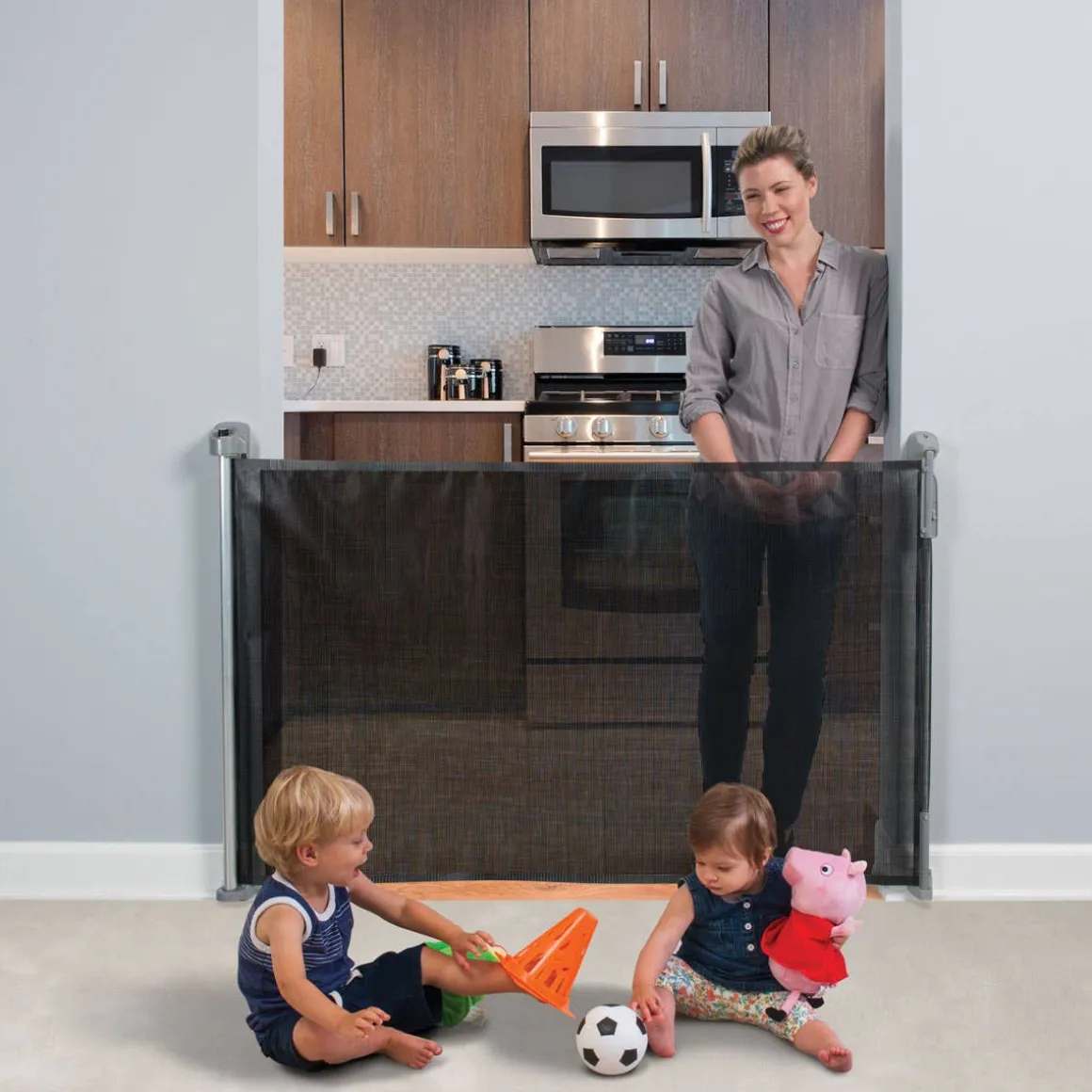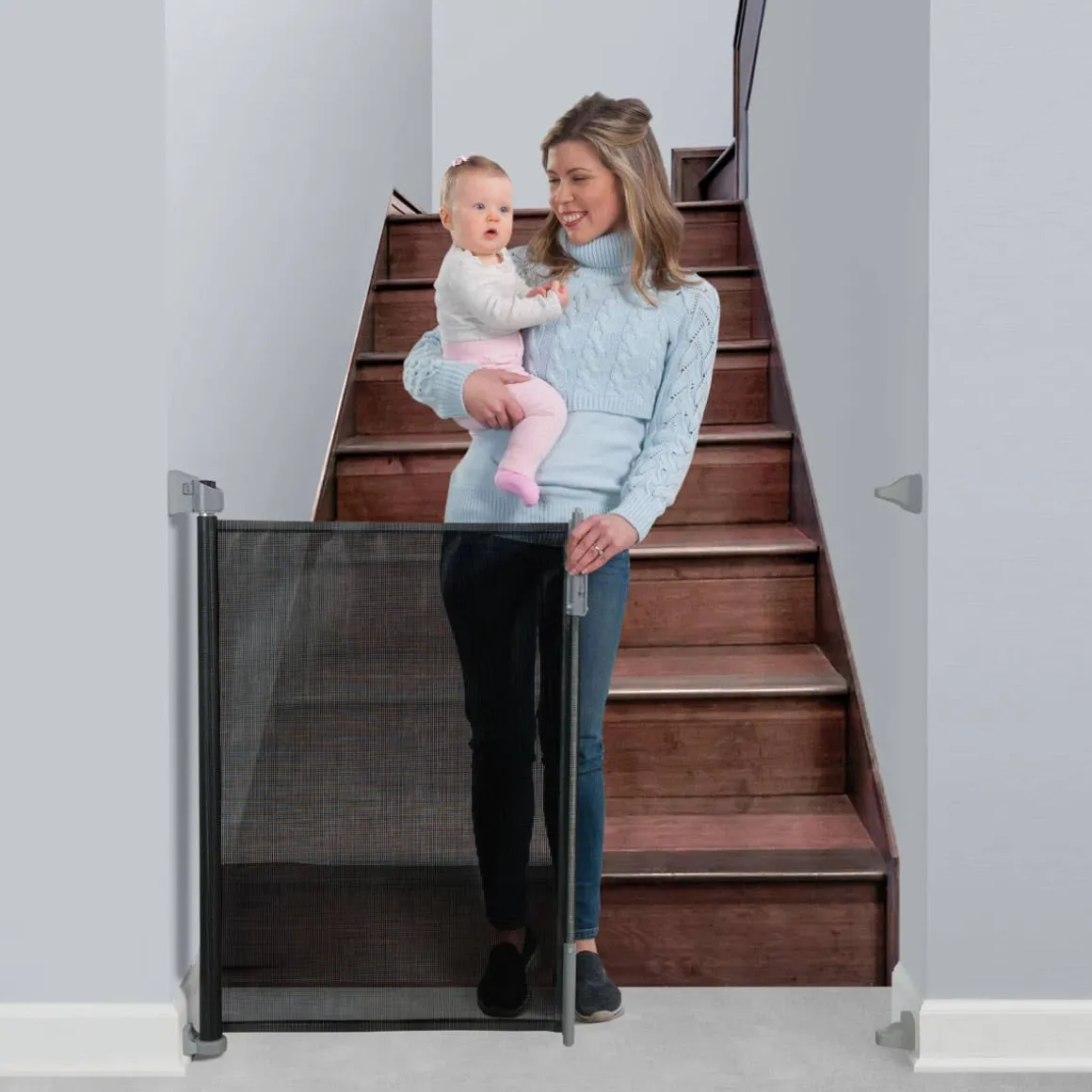 The KidCo Retractable Safeway is a flexible, yet safe mesh barrier with patented one-touch memory button to pre-set the gate width for easy and safe walk through. The super quiet recoil won’t wake your baby and the INCLUDED spacers make baseboard installation a breeze. Extends for all openings up to 55″ and features quick release hardware to stow away when not in use. Height: 33.5″.
