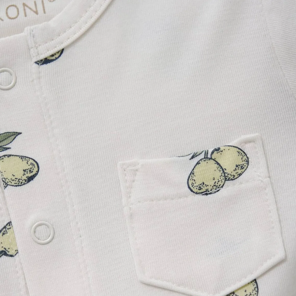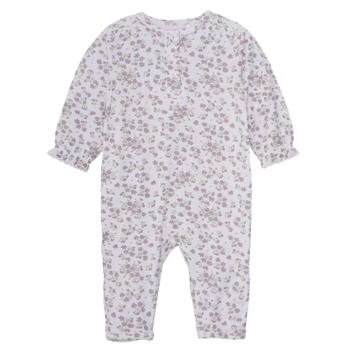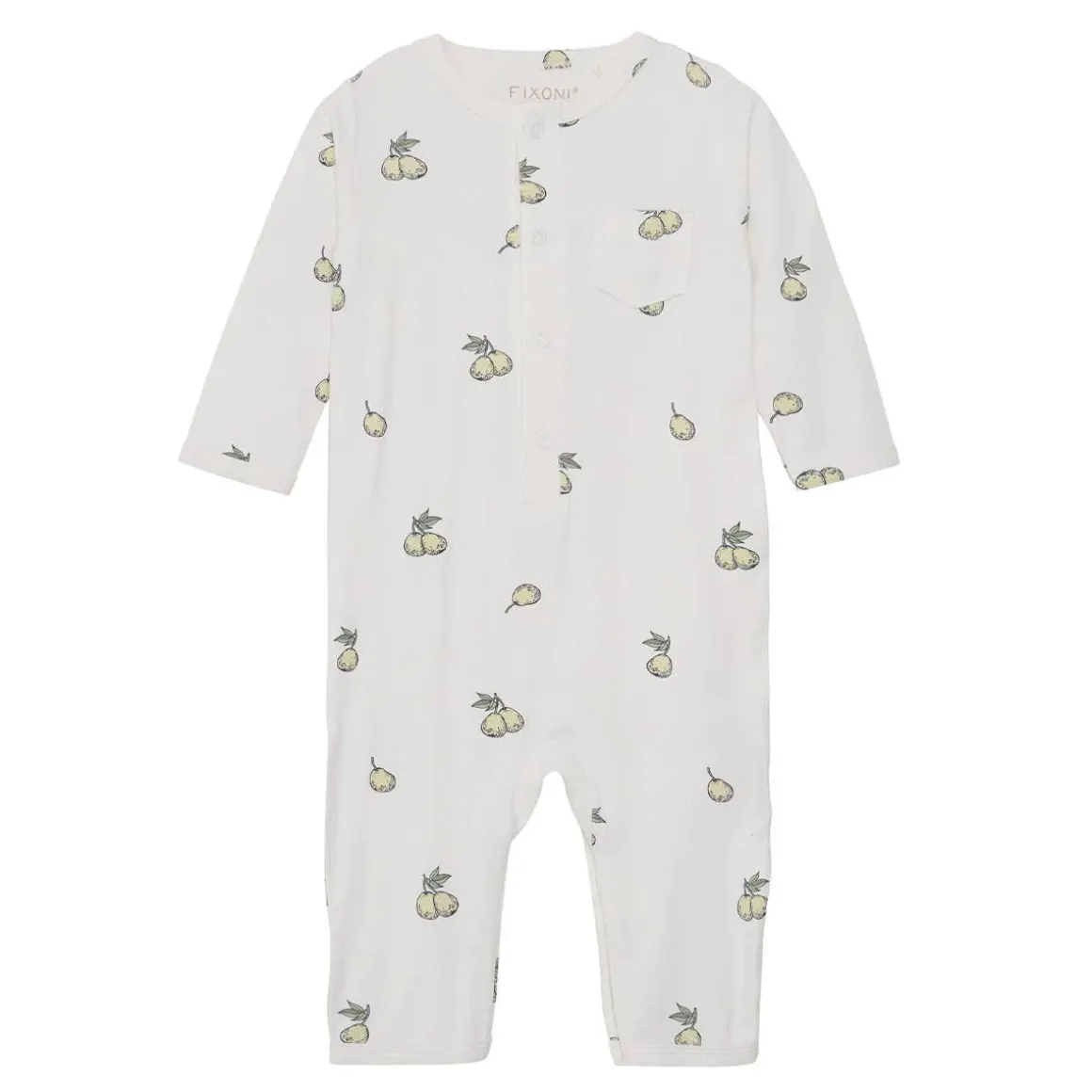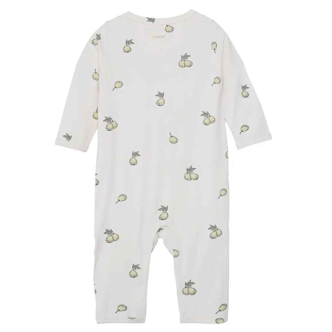 Cute all-over print romper from FIXONI. The suit has long sleeves with feet. The suit closes at the front with snaps and between the legs.