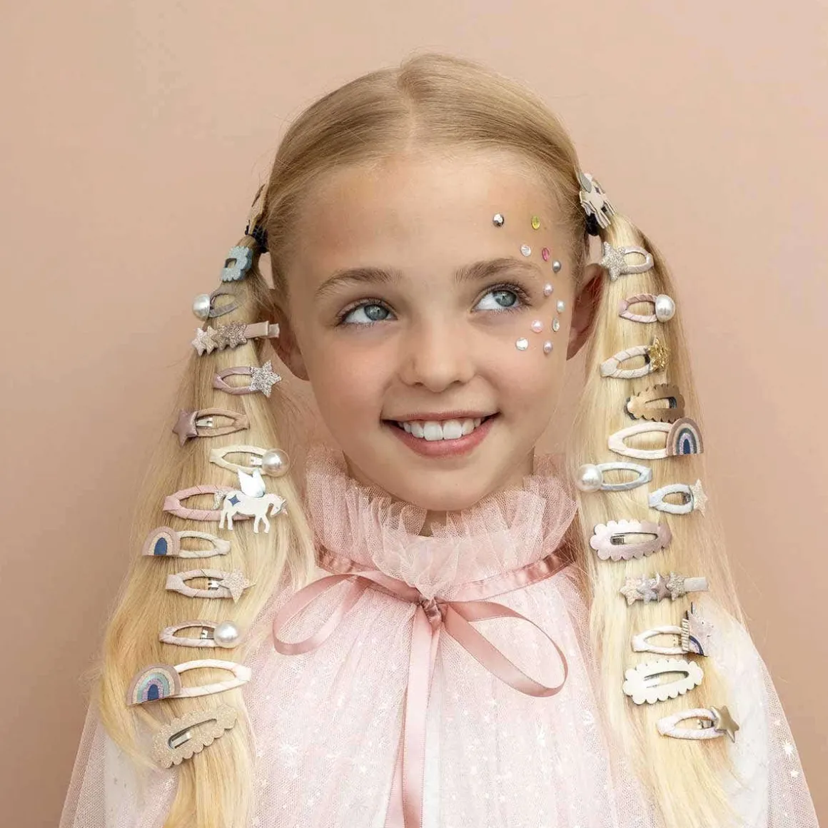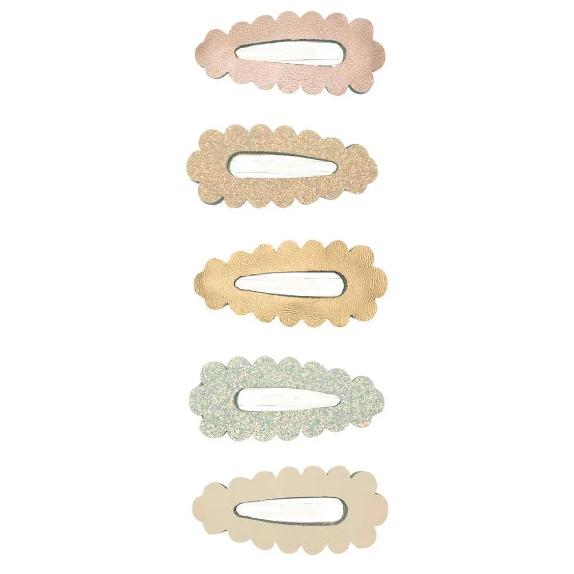 Add a touch of sparkle with these adorable scalloped mini clic clacs. Their soft, scalloped edges bring a sweet, playful charm that easily refreshes any hairstyle. Perfect for little ones who love a bit of shimmer and style!