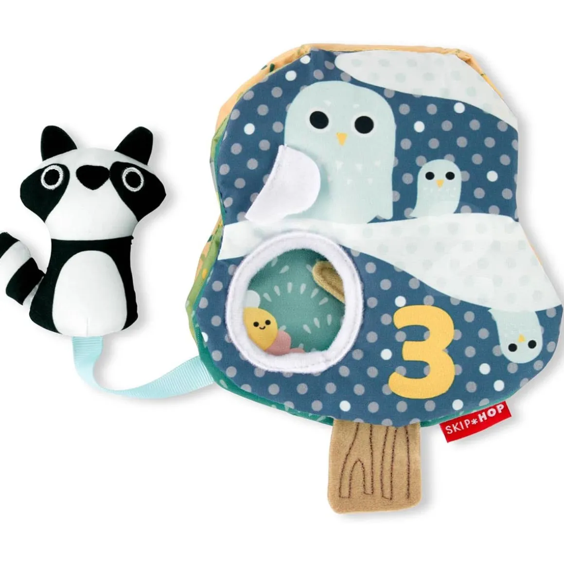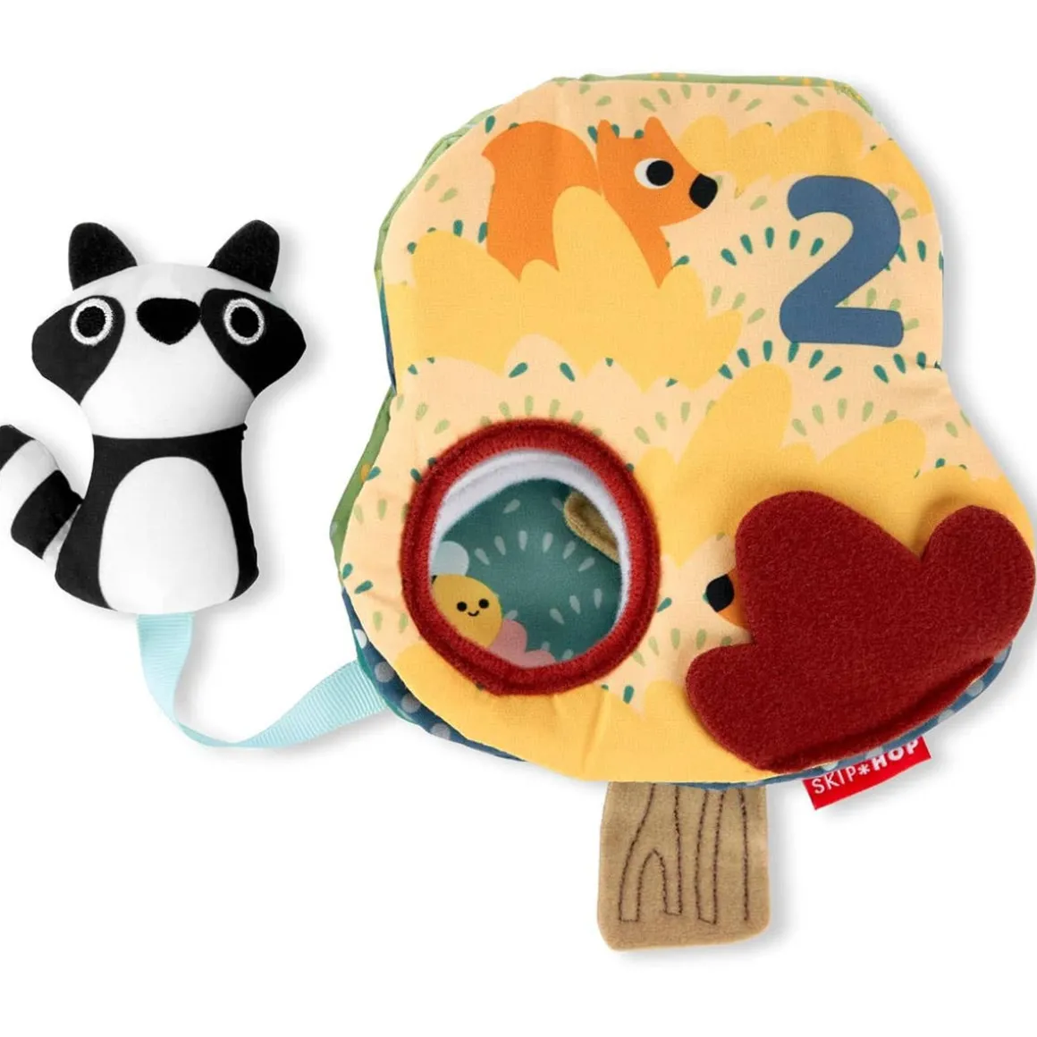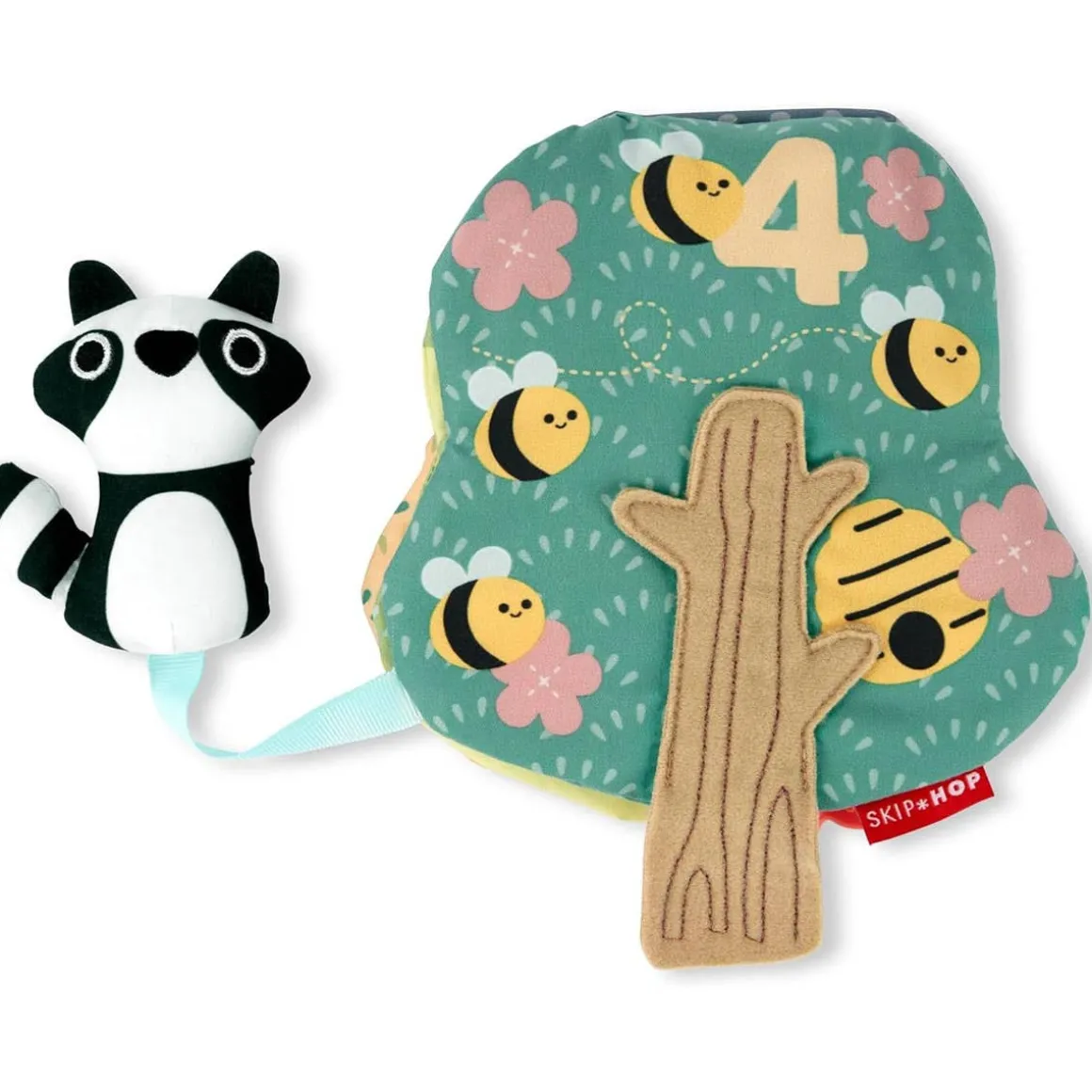 Winter, spring, summer, fall—this soft activity book introduces baby to the changing seasons with adorable nature-inspired artwork, cute animals, numbers for counting and more. Designed to encourage sensory exploration, each page features crinkle sounds, multiple textures, peekaboo play details, a baby mirror and a teether toy. For extra hide & seek fun, the soft raccoon toy can be popped in & out of the hole in each page.
