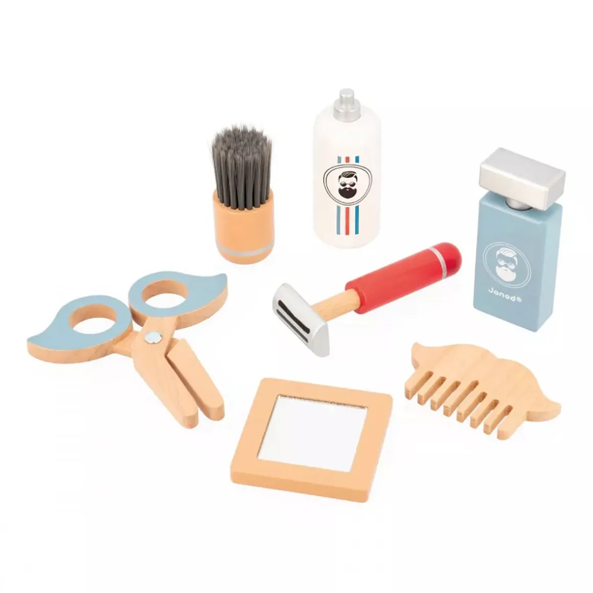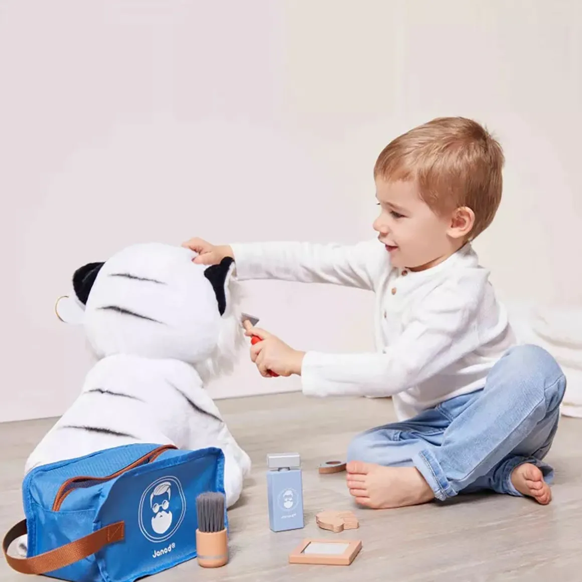 Their own shaving case! Children love to imitate older ones who use their shaving kits to get ready and look great. This set contains a whole panoply of stylish accessories that perfectly imitate hairdresser/barber equipment: a shaving brush and shaving foam for the face, a razor, a comb for the beard or the hair, hilarious scissors, a mirror to admire one’s handiwork and an aftershave to add the finishing touch! Here’s a complete pretend play toy for apprentice hairdressers! All the accessories are stored in a very practical bag that can be carried everywhere. With this wooden set, children aged 3 years and up will be able to familiarise themselves with the notion of “taking care of yourself”, yet do so in a fun way and by using their own accessories. A little trim? A little off the sides? Sit down and let your barber in the making take care of you!