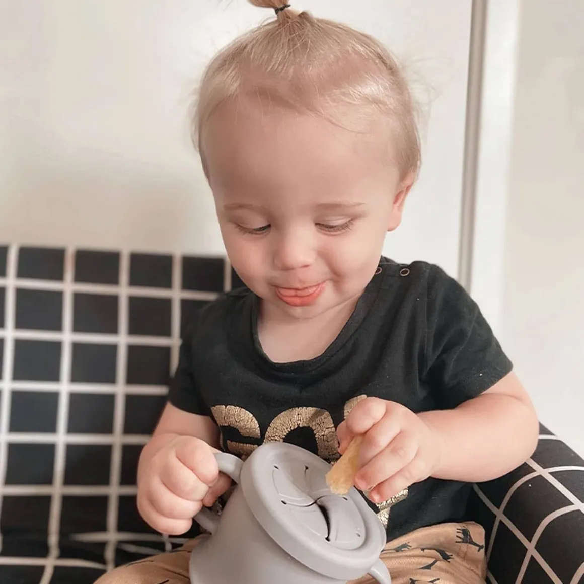 - Spillproof snack lid lets baby grab food by themselves without making a mess.