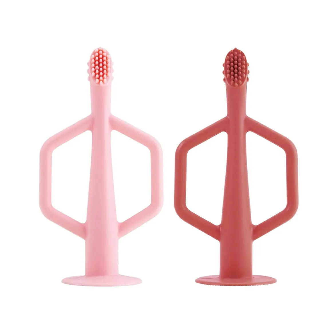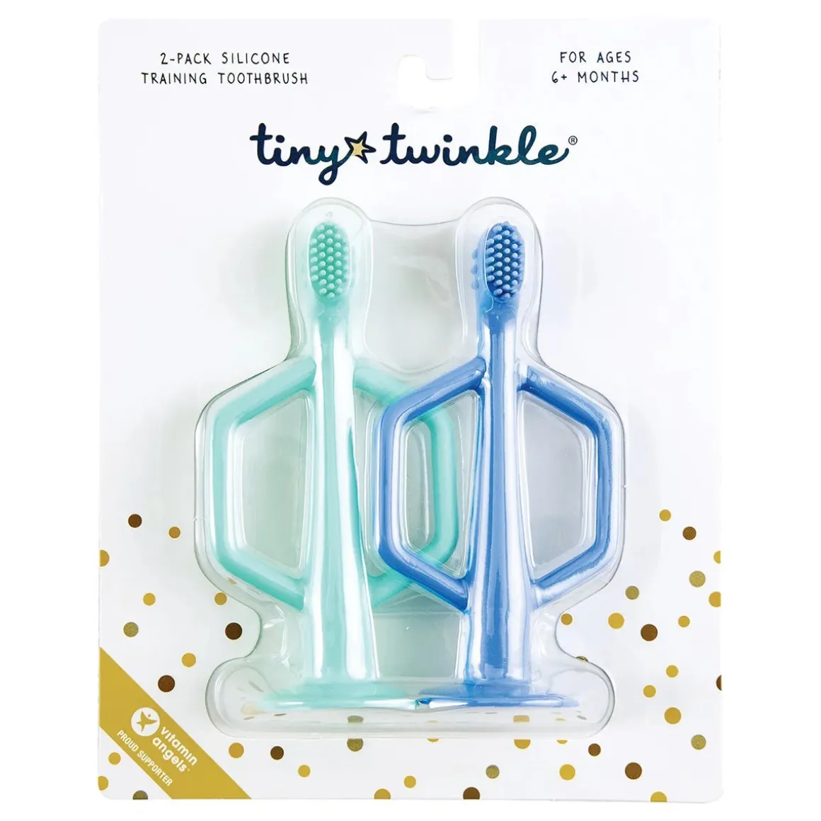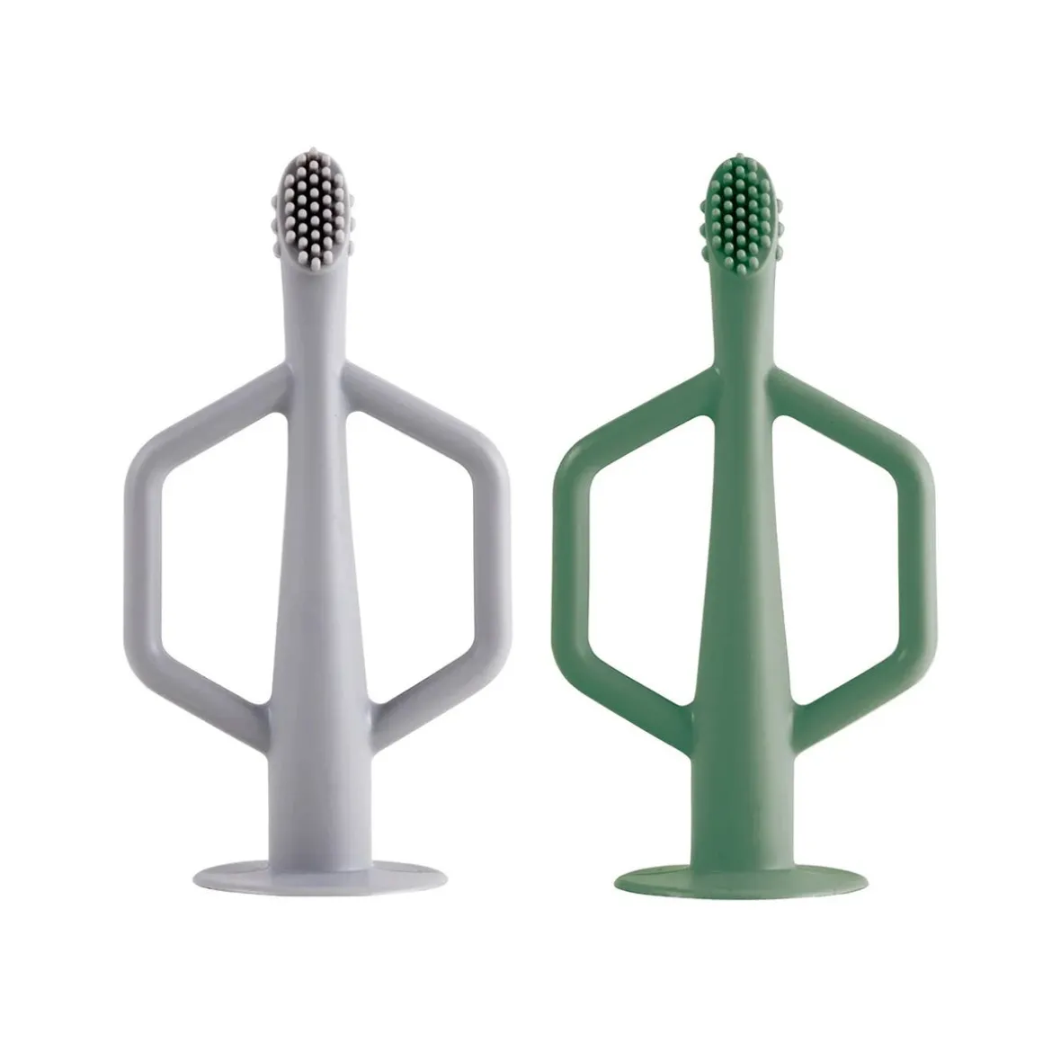 Tiny Twinkle’s Silicone Training Toothbrush 2-Pack is the perfect way to encourage early dental hygiene! Made from 100% food grade silicone, the Training Toothbrush is both durable and soft on baby’s gums. Featuring multiple textures to massage and stimulate baby’s gums, the toothbrush also has soft and gentle bristles to help clean new baby teeth. Easy to grip handles make using the toothbrushes simple for little ones. Suction base keeps the toothbrush upright and away from germs. Dishwasher and freezer safe. For ages 6 months and up.