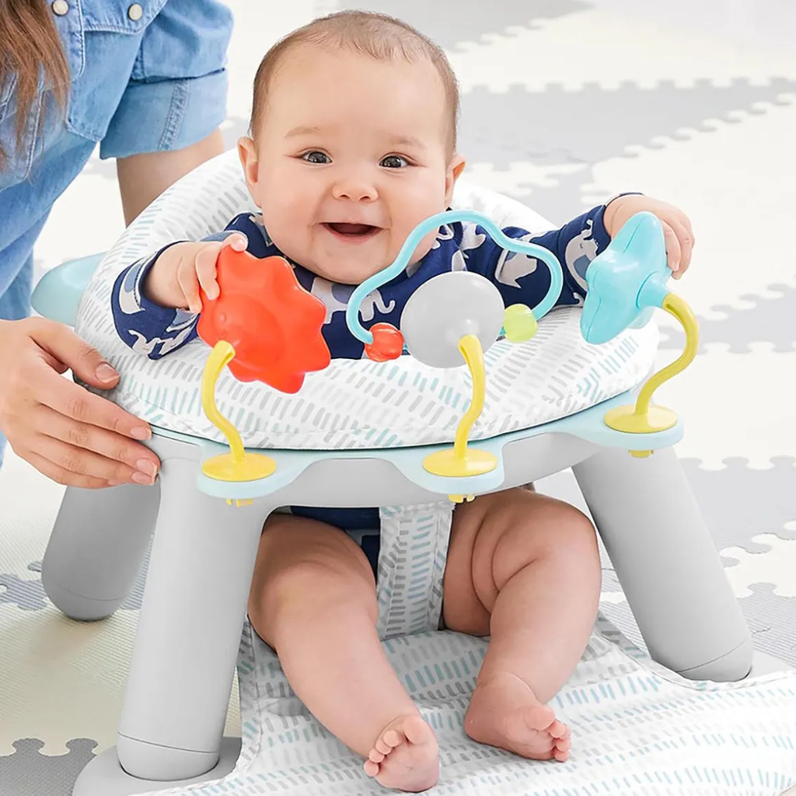 Encourage baby to sit, interact and play with this comfy and supportive seat. The dual-option design lets parents rotate between the handy multipurpose tray (great for snacks!) and three engaging toys depending on baby’s needs. The sturdy, wide-leg base provides stability and the soft fabric seat cover removes for easy machine washing so clean up time’s a cinch.