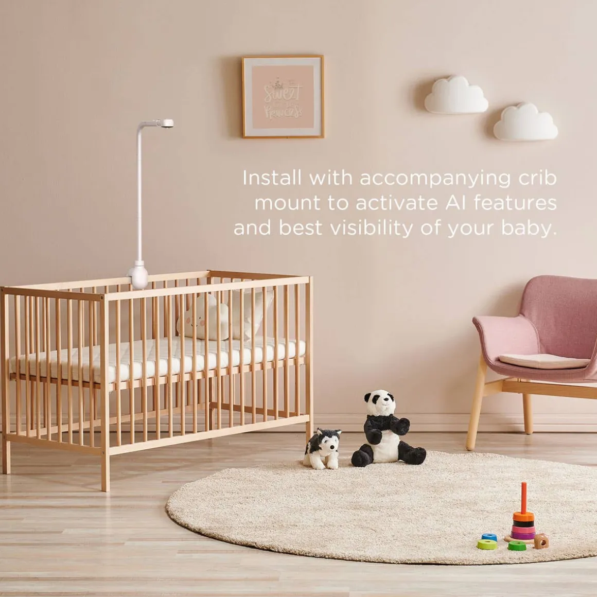 The Adjustable Crib Mount gives parents the perfect camera placement, to monitor their babies. Take full advantage of the NEW range of AI intelligent features, including the Covered Face Alert, Sleep Analytics, Baby Eye Wellness Trackerand Precious Baby Moments and stay connected and enjoy continuous monitoring with confidence. As baby grows, use the Flexible Desk Mount to monitor from another mounting location for ease and safety. Also perfect for when your family is on the go!