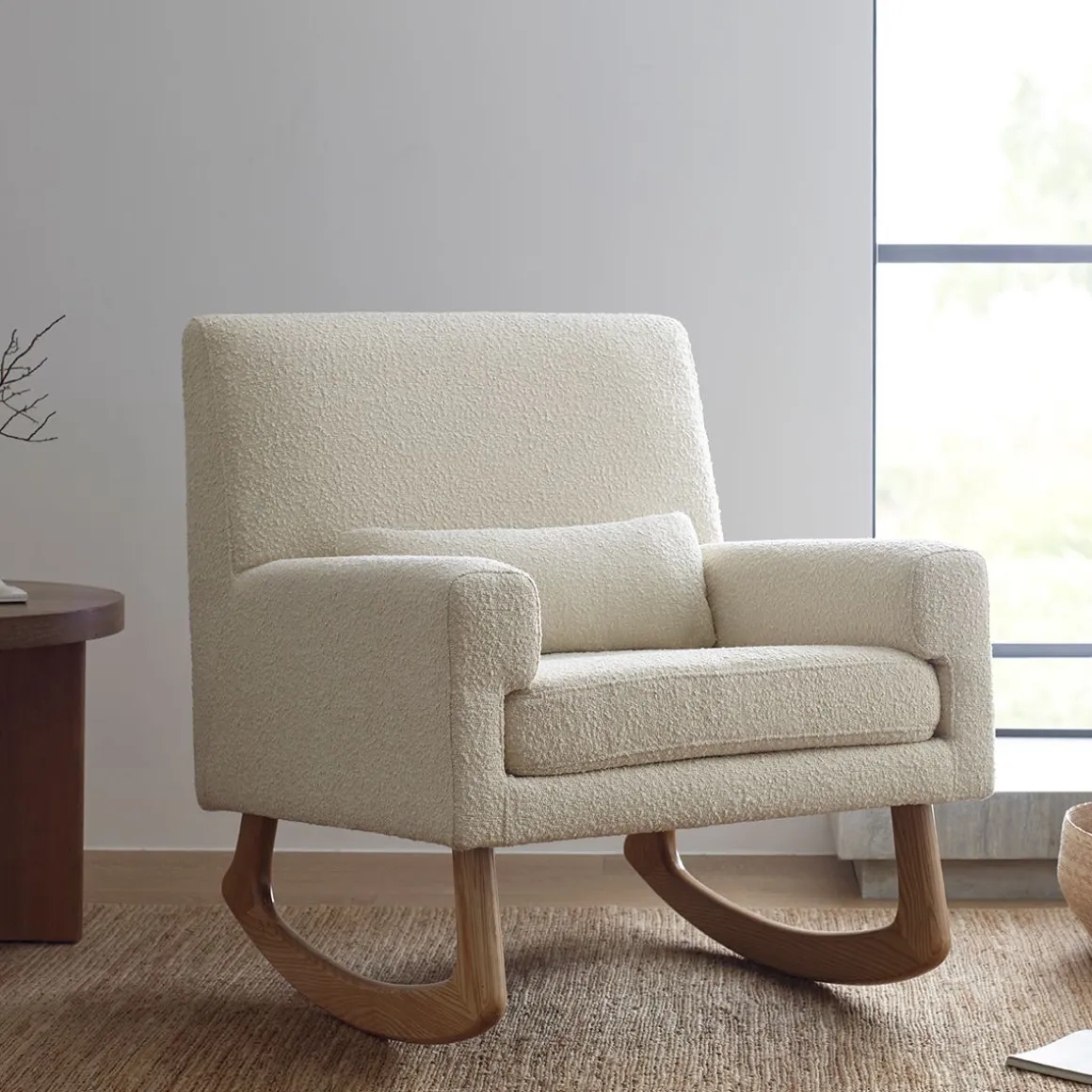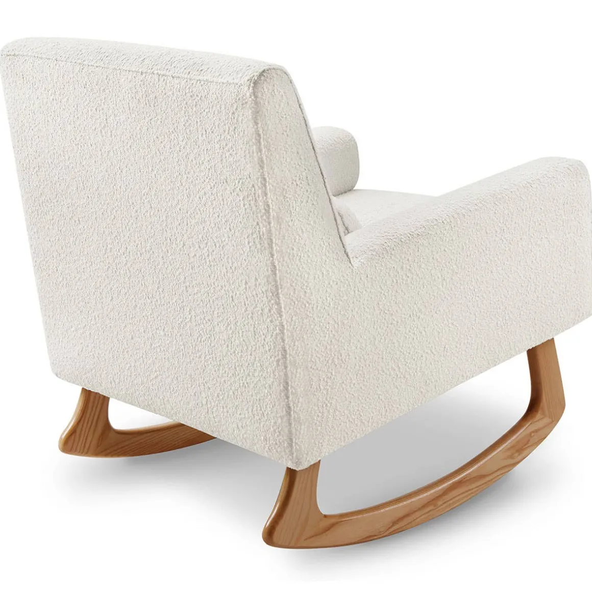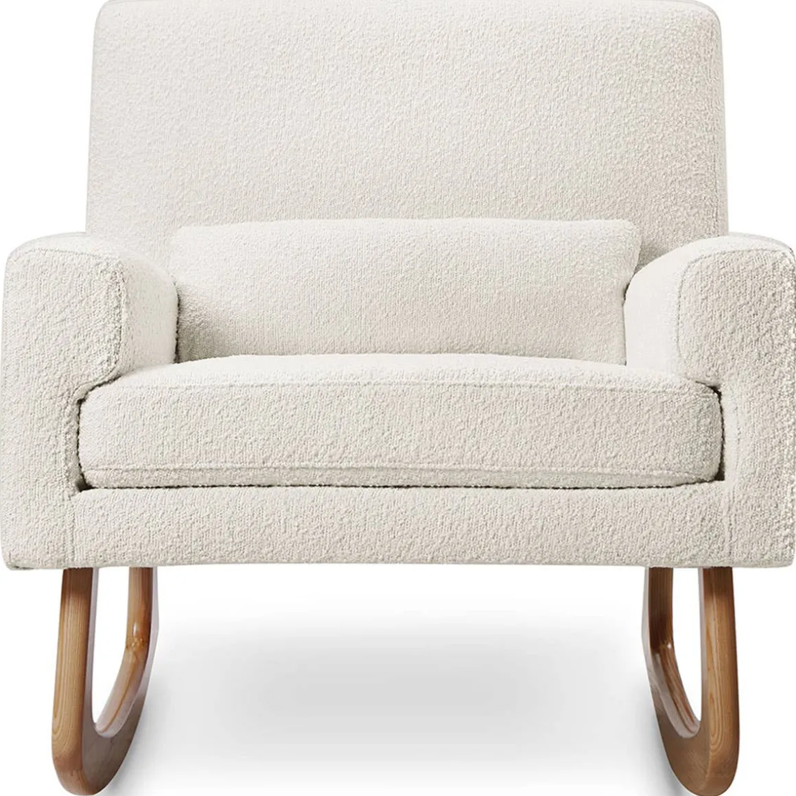 The well-balanced Sleepytime Rocker is lightly padded and finely upholstered with a fitted back using a subtly textured boucle-like fabric. Ash hardwood legs allow for a smooth rocking motion.