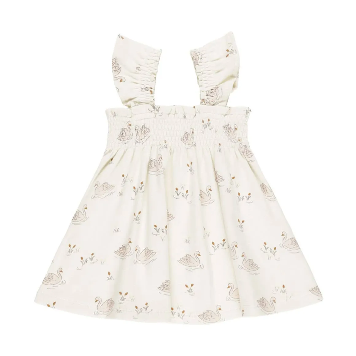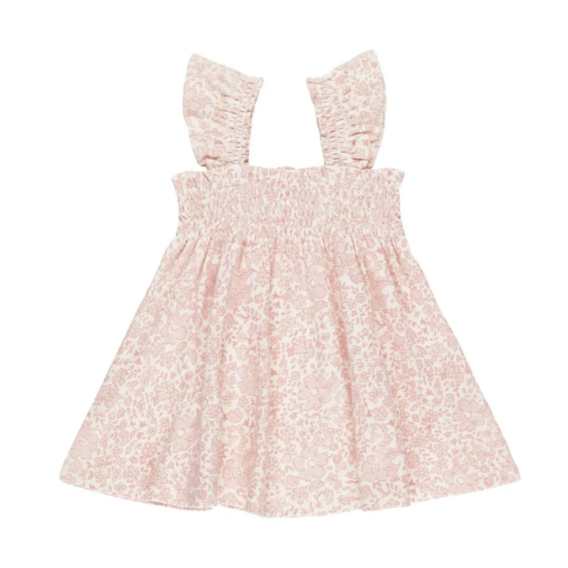 Sweet and easy dress with a smocked bodice, ruffle detail on the straps, and a full skirt. Coordinating bloomers included.
