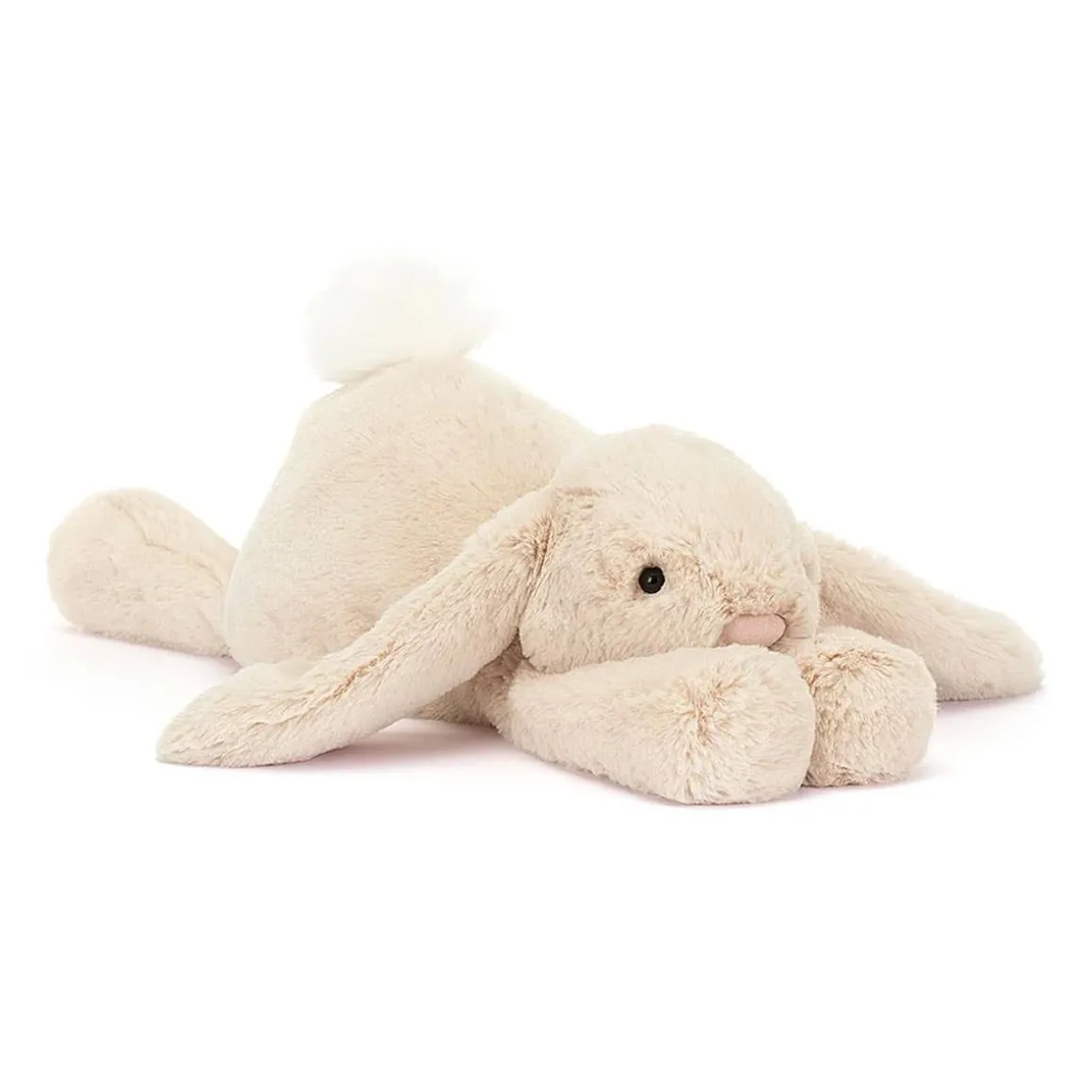 Smudge Rabbit is such a sleepy sweetie – always sprawling out, lazing on the bed or rug! Scrumptiously soft in oatmeal fur, this lop-eared lazer just captures the heart. An incredibly lopsy and loving companion, Smudge is a great gift for any bouncing baby. Bonnets and bobtails – we like it!
