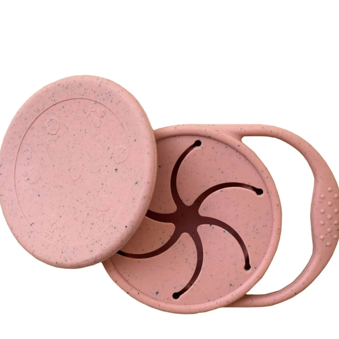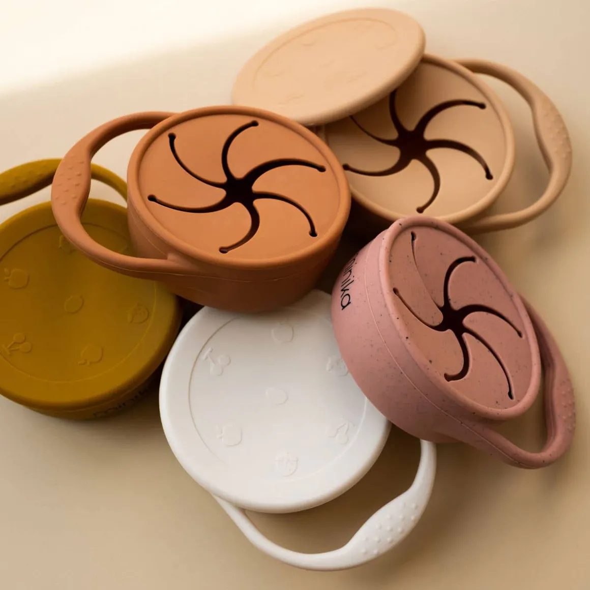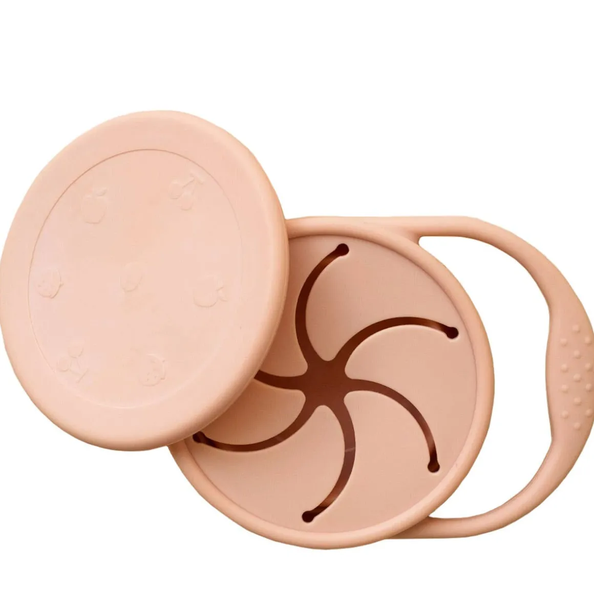 Silicone snack bowl with resealable lid. Food grade BPA free silicone. Ideal for carrying snacks. Handle to help the child hold it while tasting! Foldable on itself for the possibility of 2 sizes!