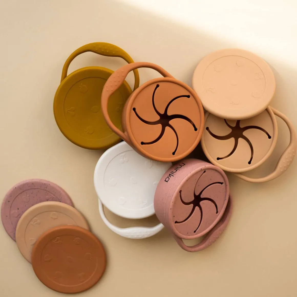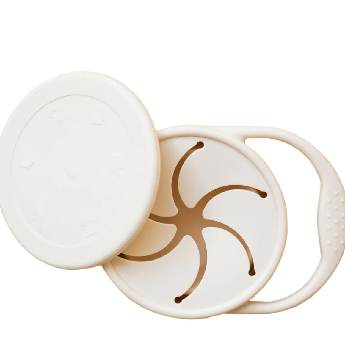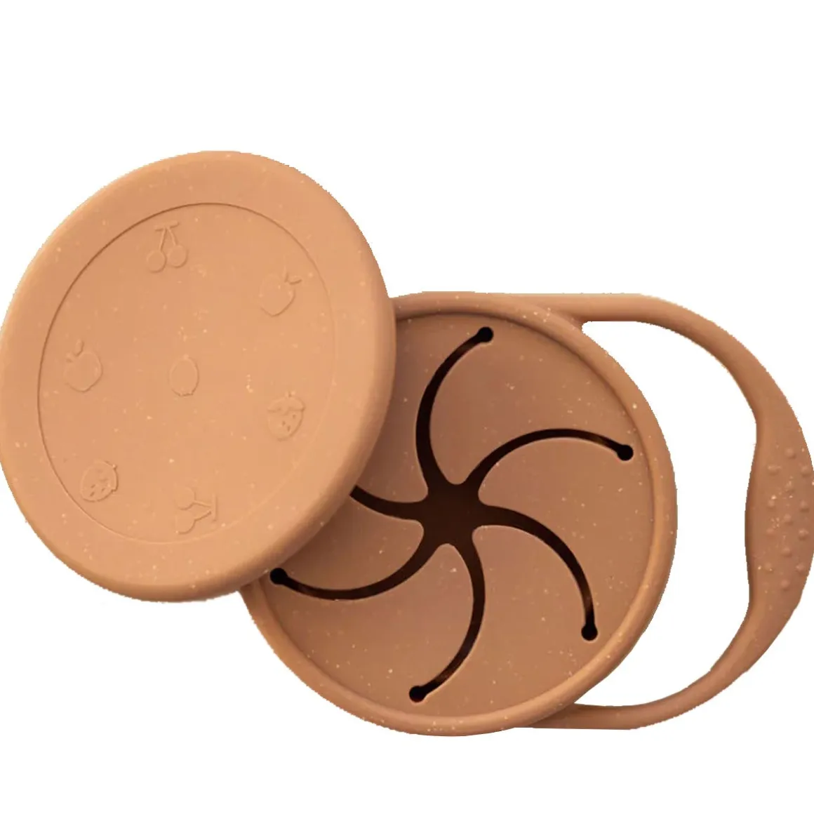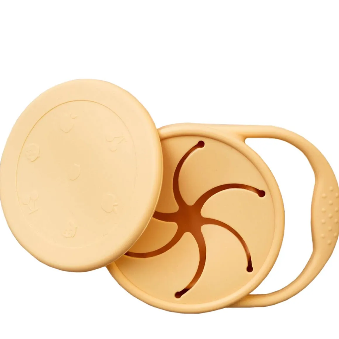 Silicone snack bowl with resealable lid. Food grade BPA free silicone. Ideal for carrying snacks. Handle to help the child hold it while tasting! Foldable on itself for the possibility of 2 sizes!
