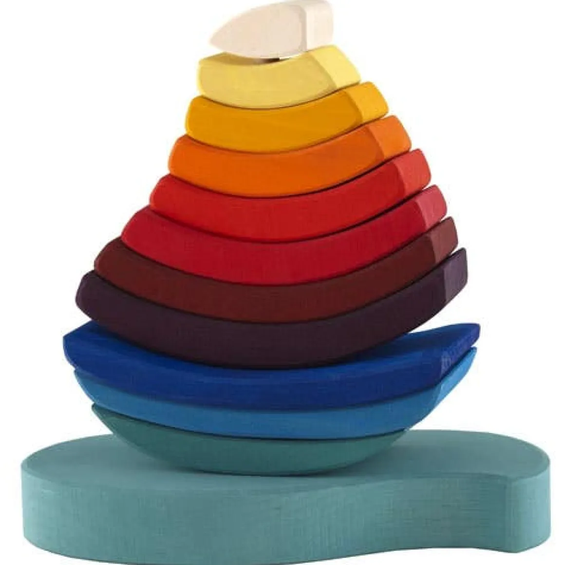 This stunning, solid-wood stacking sailboat is nearly a foot tall! The eleven large, flat pieces can be stacked in a variety of ways, either on or off the post, or used imaginatively as bridges, fences or to build houses. While playing, young children can learn about size and sequencing as well as exercise their fine motor skills. Wonderful, durable toy for a daycare or preschool. This toy is made from European alder wood and hand finished with non-toxic, water based dyes.