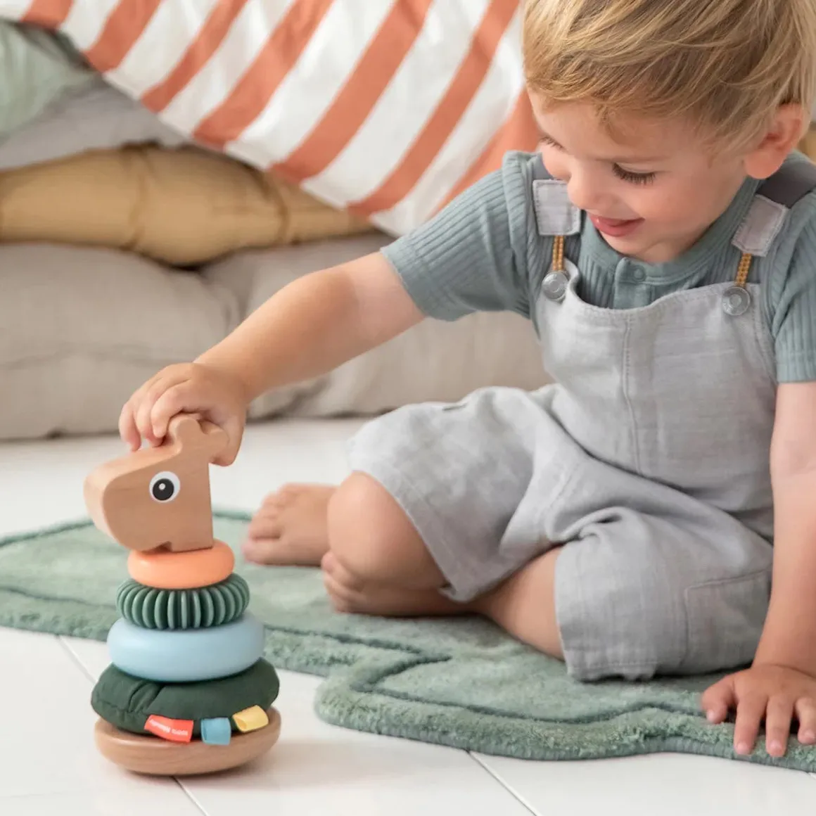 The Raffi stacking tower has four rings that your little one can stack to build the body of the giraffe. Let your child enjoy the many sensory surfaces, stimulating features and many hours of play with the Deer friend Raffi.