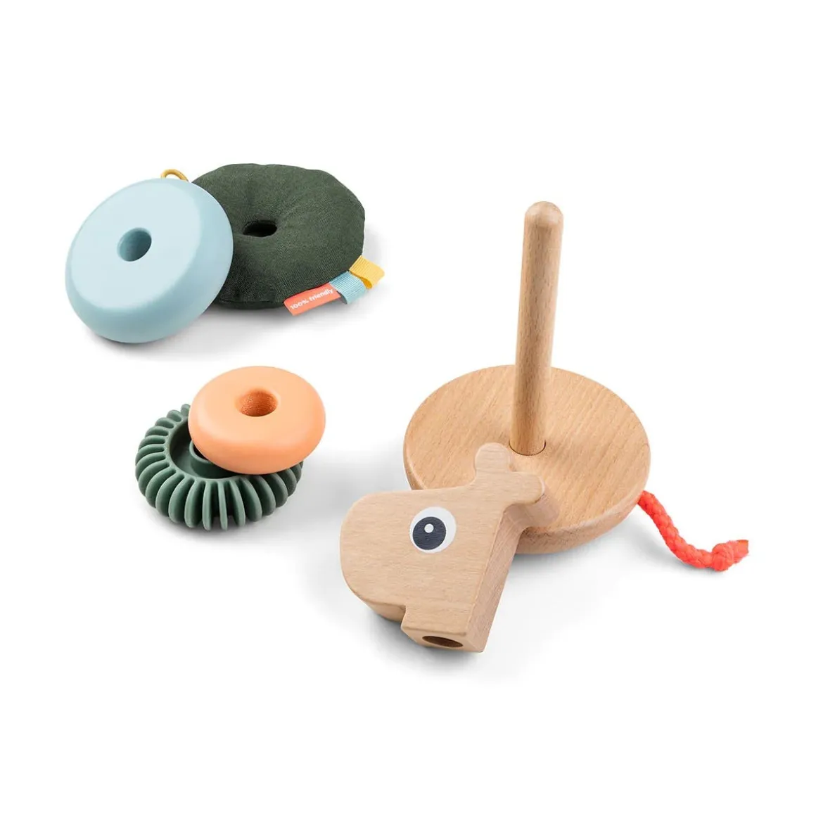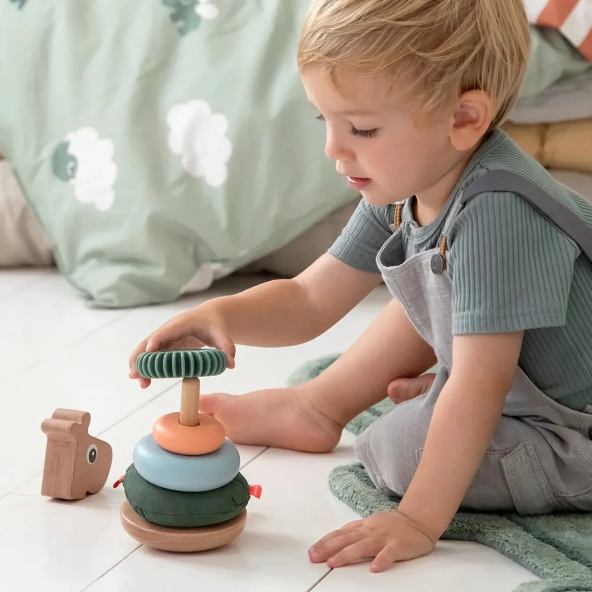 The rings are made in different sizes – some of them with small tags, textile and grooves. The stacker also has a tilt function and a short tail to be pulled – both designed to stimulate the senses of your child through play.