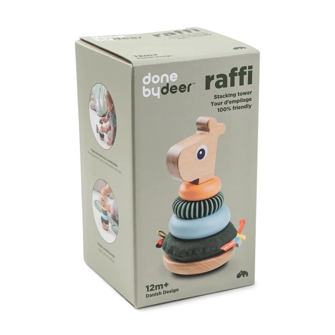 Raffi stacking tower is designed in a colourful mix. The wooden toy is made from responsibly sourced wood and painted with water-based paints that are free from harmful subtances – making it safe for your child to use.