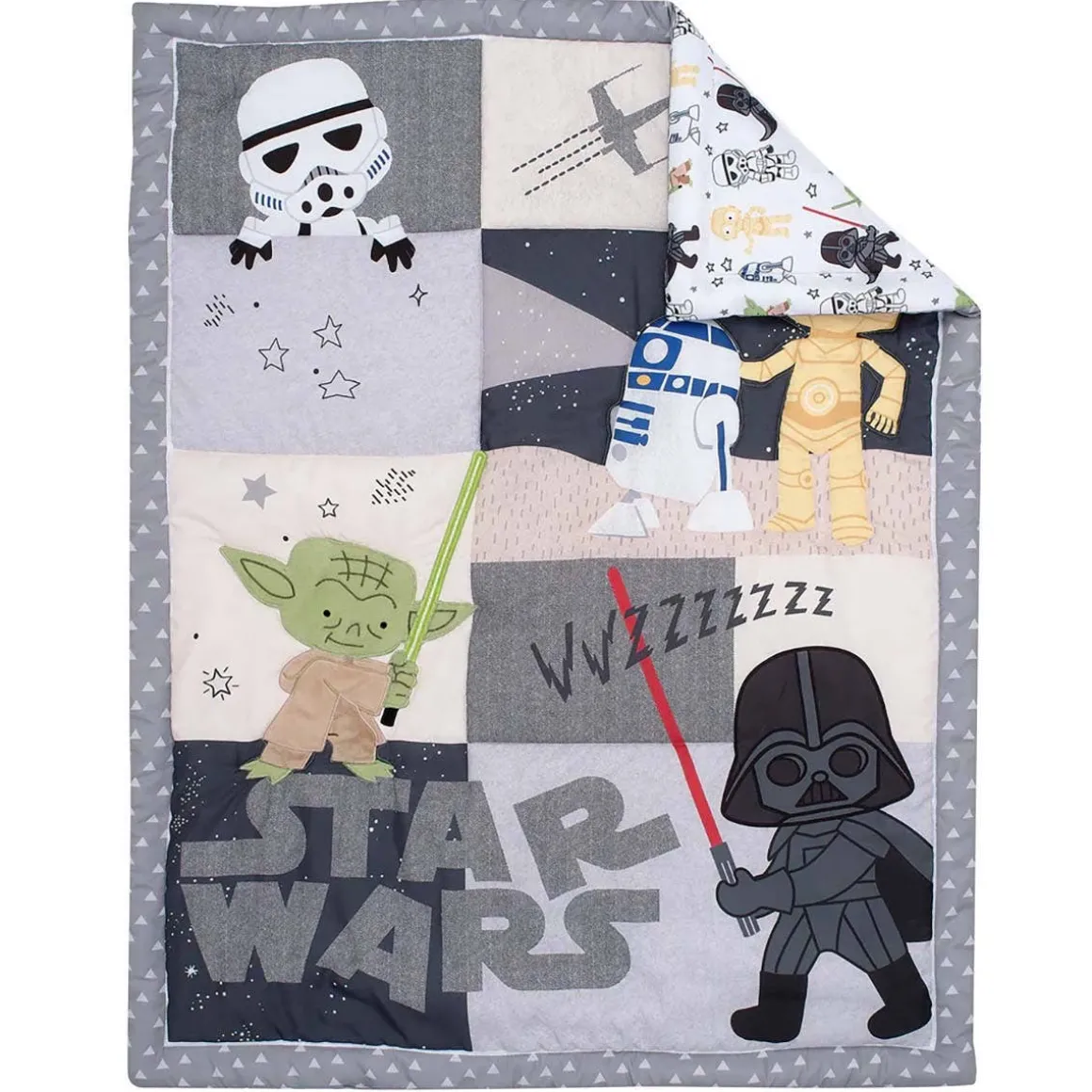 Your child’s sleep space will be the coolest in the galaxy with this Star Wars Classic three-piece crib bedding set. It includes one quilt, one fitted crib sheet, and one crib skirt in a super soft microfiber fabric. The quilt features Yoda, Darth Vader, C-3PO, R2-D2, and a storm trooper. Yoda is fully appliqued, and is holding his embroidered light saber. The fitted crib sheet includes Darth Vader with his iconic cape, R2-D2, C-3PO, and of course a Stormtrooper. This crib sheet has elastic all the way around, ensuring a safe and secure fit on a standard size crib/toddler mattress measuring 28” X 52”. The crib skirt adds the finishing touch to your child’s crib. It features R2-D2, Darth Vader, C-3PO, Yoda, and Stormtroopers in a galactic sky. The crib skirt is made with split corners for easy placement and has a 10” drop.