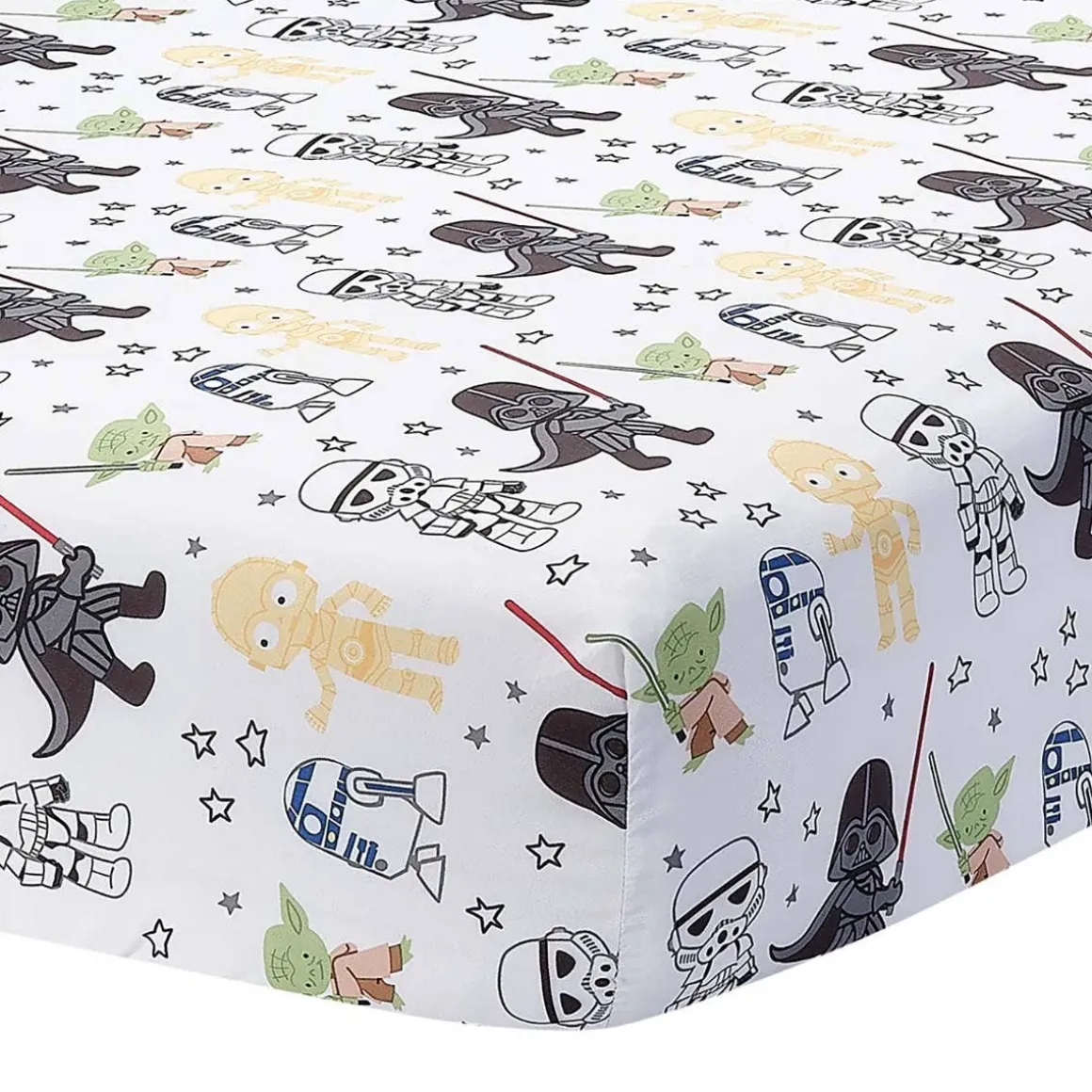 Your little Jedi-in-training will love having this officially licensed Star Wars Classic fitted crib/toddler sheet. It includes Darth Vader and Yoda with their lightsabers, as well as R2-D2, C-3PO, Stormtroopers and tossed stars. It is made in a super soft microfiber fabric. There is elastic all the way around ensuring a safe and secure fit on a standard size crib/toddler mattress measuring 28” X 52”. Machine washable for easy care.