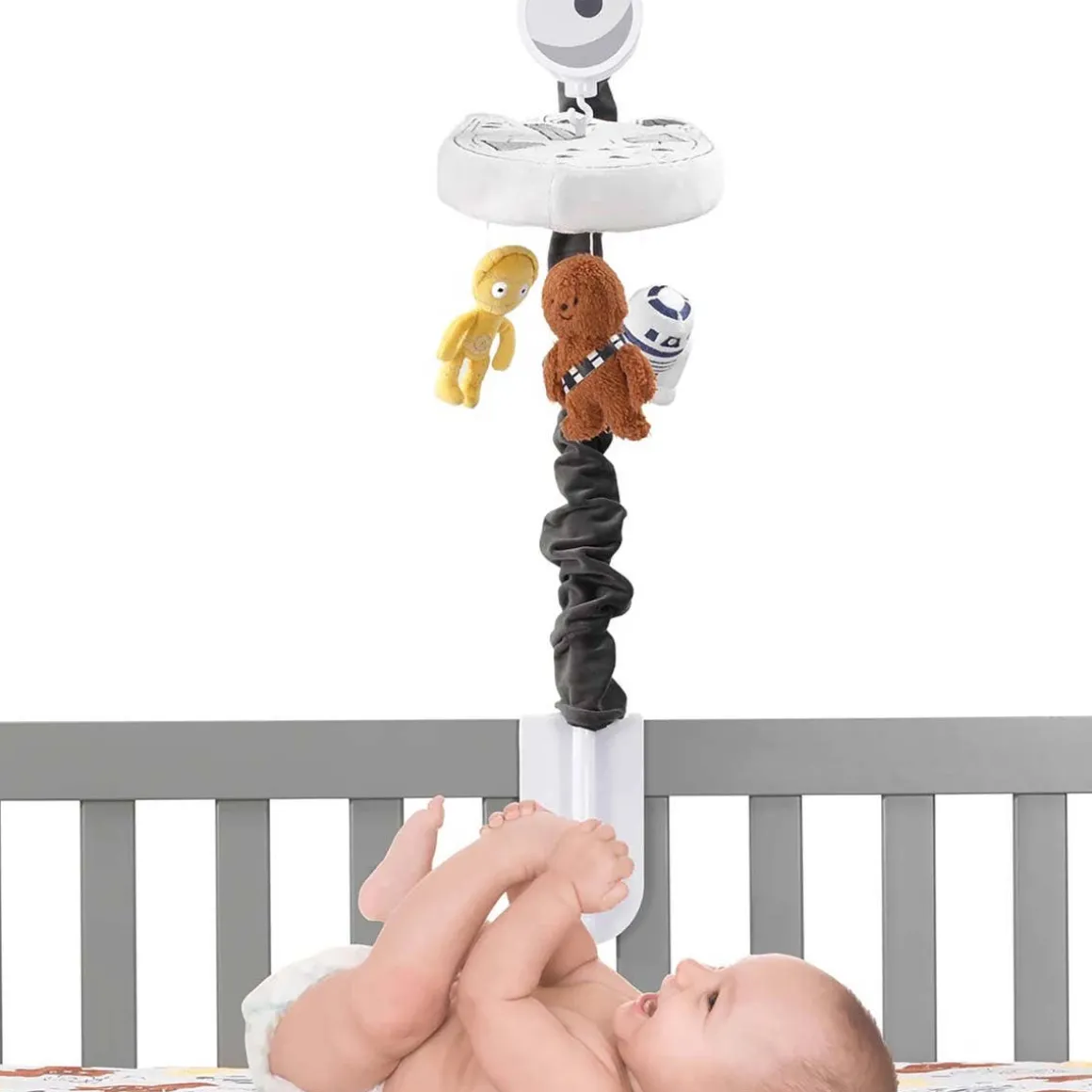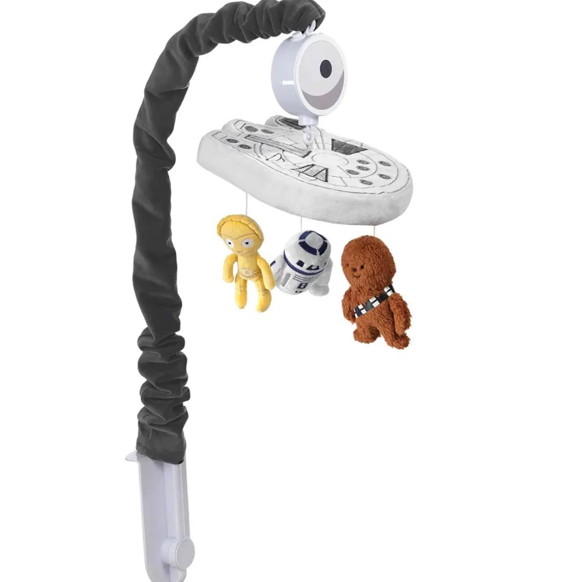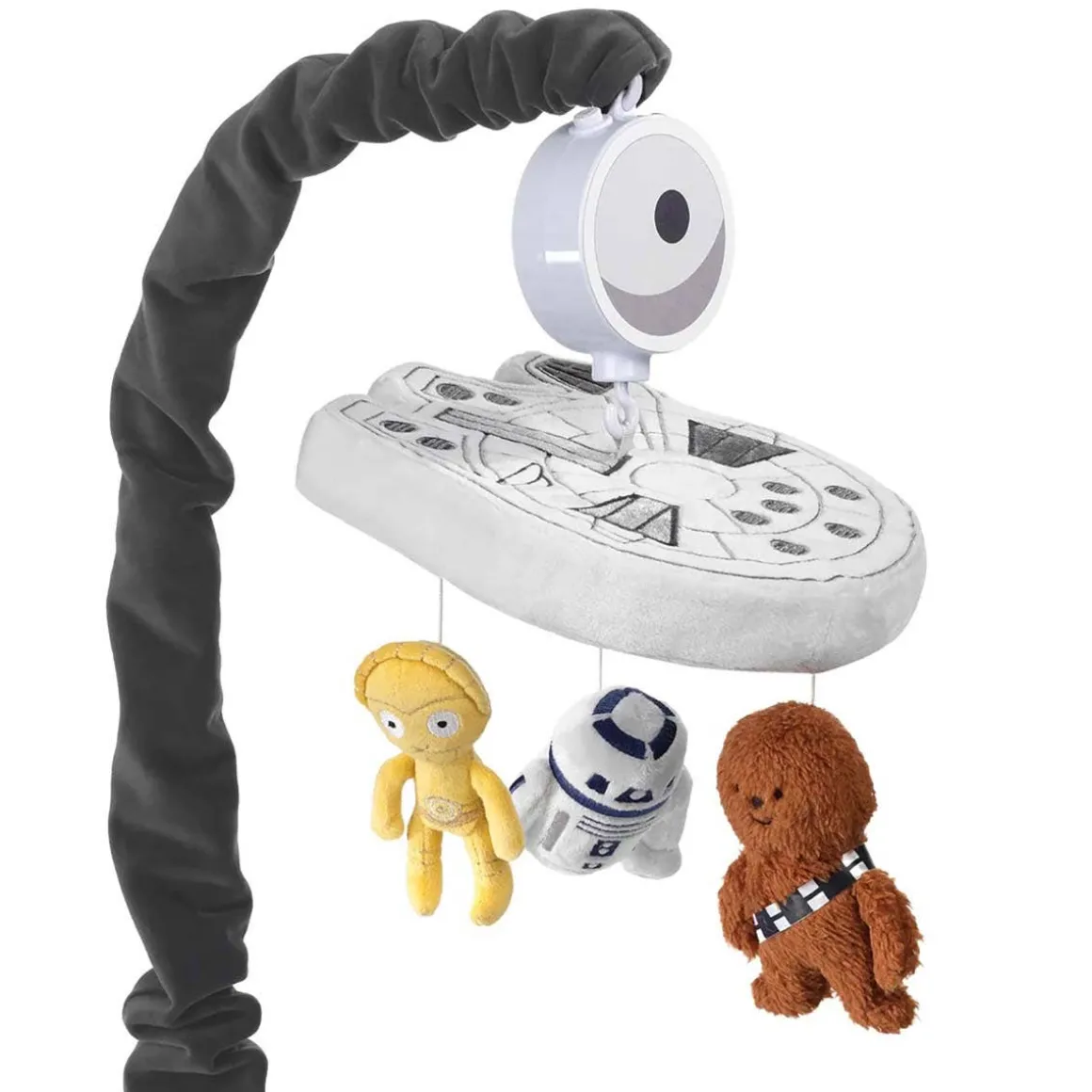 - Embroidered and appliqued Star Wars Millennium Falcon with Chewbacca, R2D2 and C-3PO rotating slowly to nursery song favorites for 20 minutes