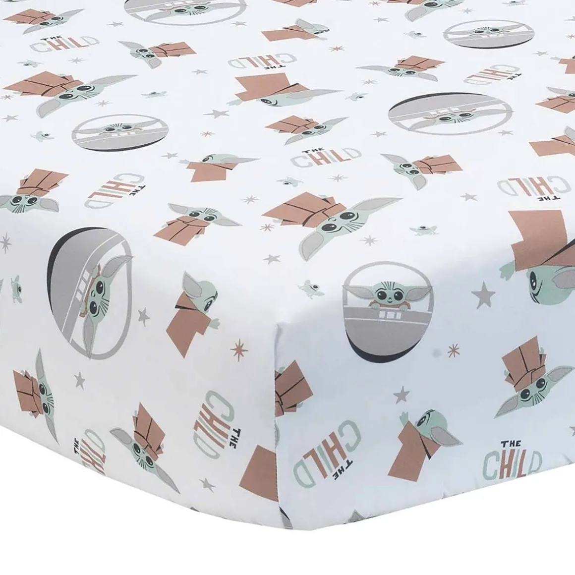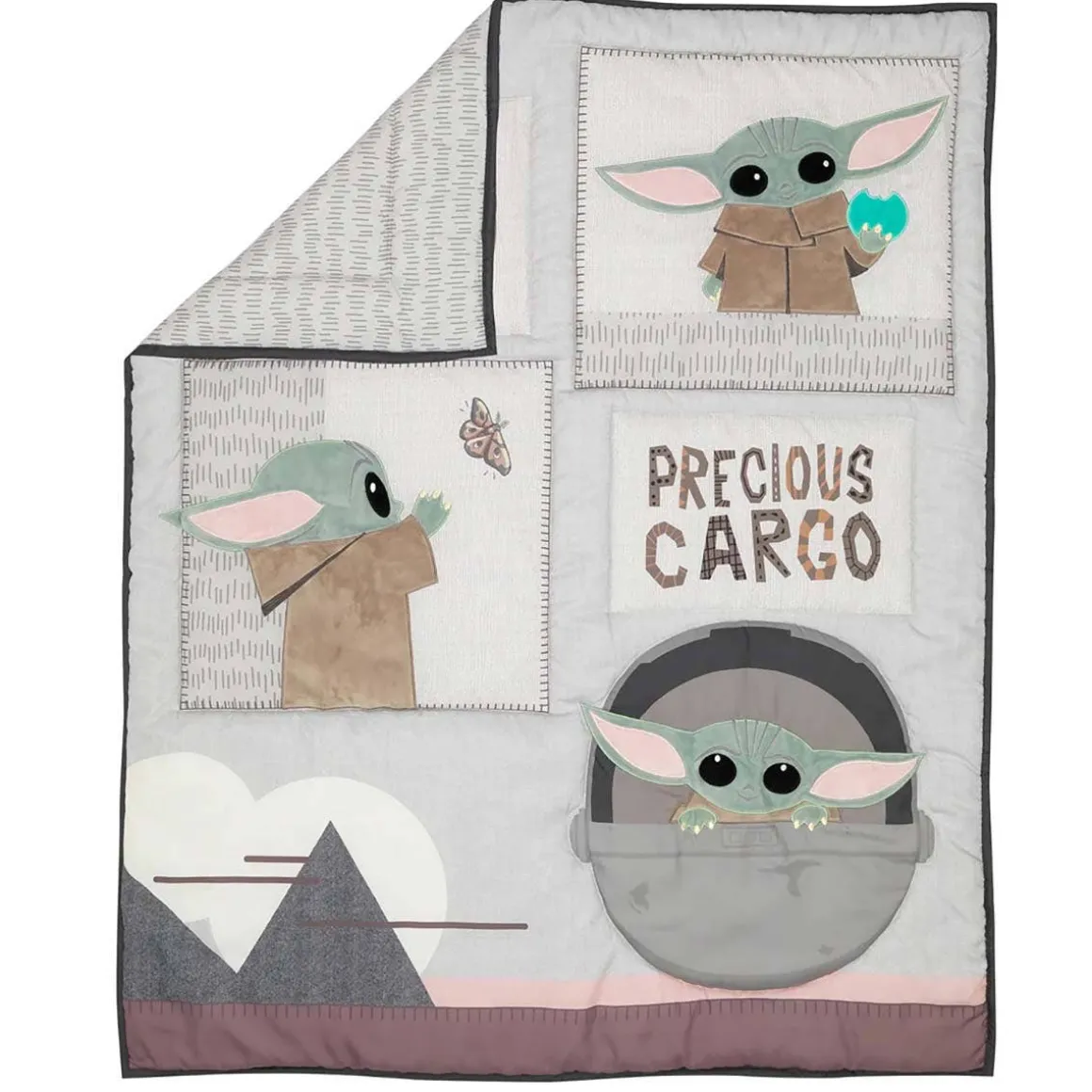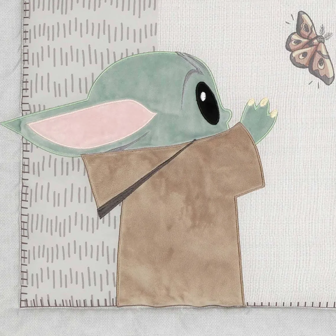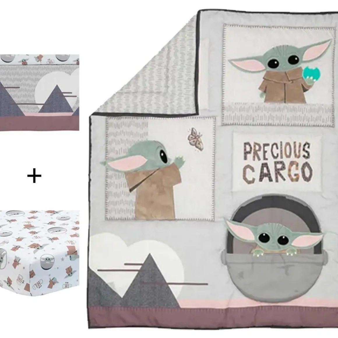 The Child aka Grogu and Baby Yoda is so cute and sweet even down to his tiny little feet. Your little padawan (Jedi-in-training) will love this amazing officially licensed Star Wars Mandalorian 3-piece nursery bedding collection which includes one quilt, one fitted crib sheet and one crib skirt. Unique patches on the quilt feature The Child/Baby Yoda in his taupe colored minky robe. His body is appliqued with minky and velour fabrics. His face is expertly embroidered, and his large eyes and inner ears are appliqued. The fitted crib sheet is made of a soft microfiber material and features The Child in several different poses including in his pod. The words “The Child” are scattered around this crib sheet and there is elastic all the way around ensuring a safe and secure fit on a standard size crib mattress measuring 28” X 52”. The 14 ½” crib skirt adds the finishing touch to your child’s crib. Made of a soft microfiber it features three mountains and cream-colored planets.