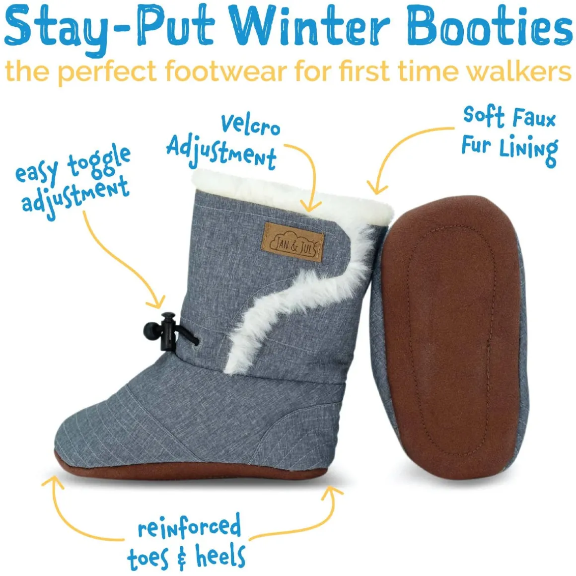 Stay-Put Winter Booties are designed with developing little feet in mind. Lightweight with a flexible, non-slip sole to naturally support growing muscles and bones. Made with a faux fur lining to keep little toes toasty warm, perfect as cozy indoor slippers at home or daycare. These baby booties are available in three sizes, making it easy to find the best stay-put fit, for the littlest babies to first-time walkers!