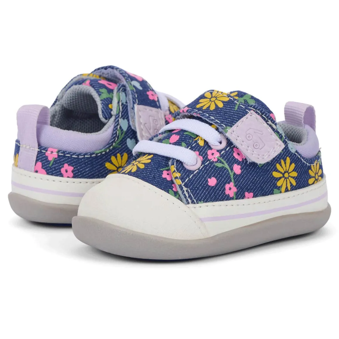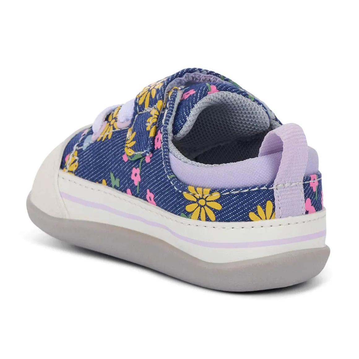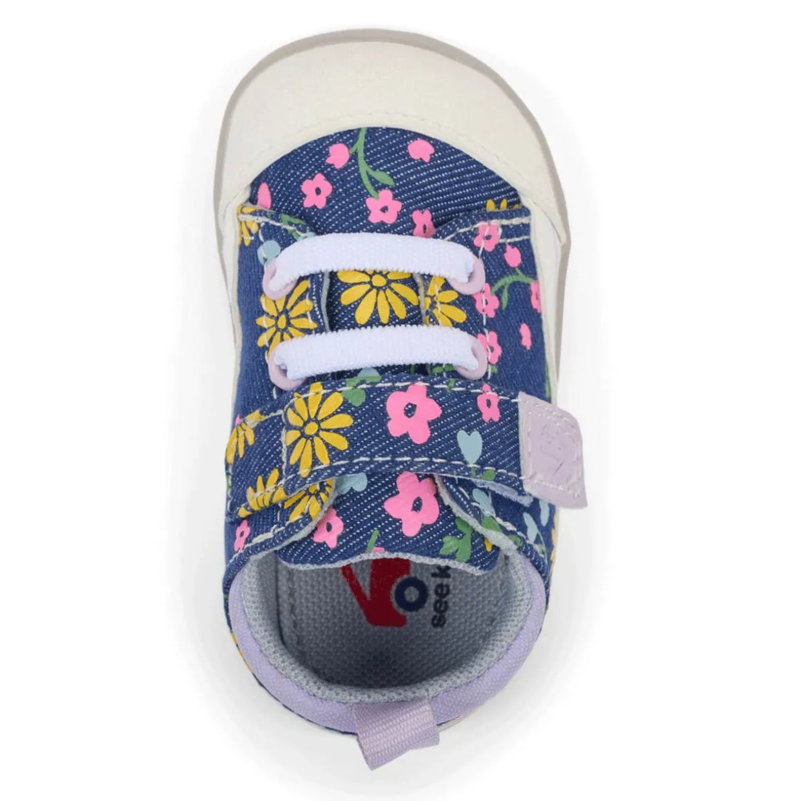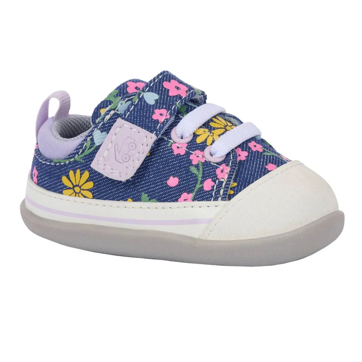Watch the world expand step by step in the Stevie first walker. Fun, vibrant florals, eco-friendly recycled materials and a flexible rubber outsole combine to create a lightweight, comfy pair perfect for budding adventures. Floral-print cotton denim upper with recycled polyester and nubuck-feel details, plus rubberized toe cap to protect little toes.