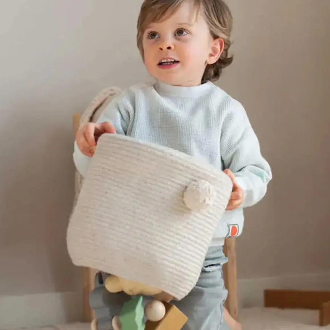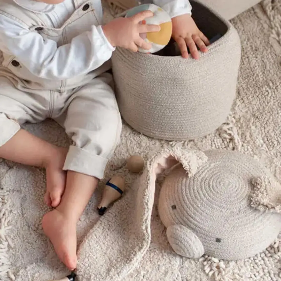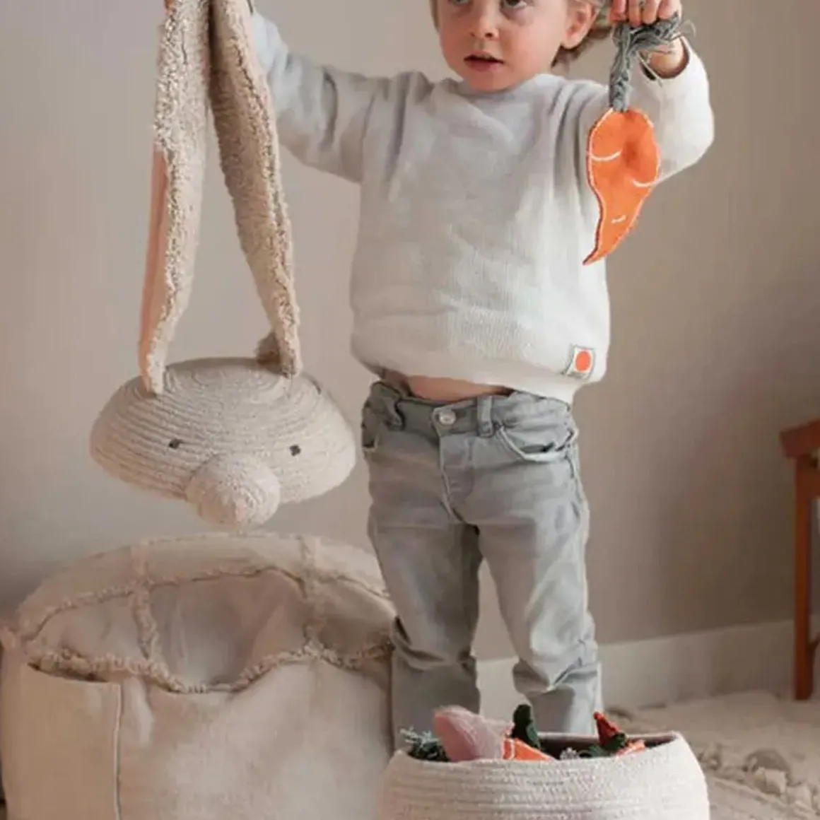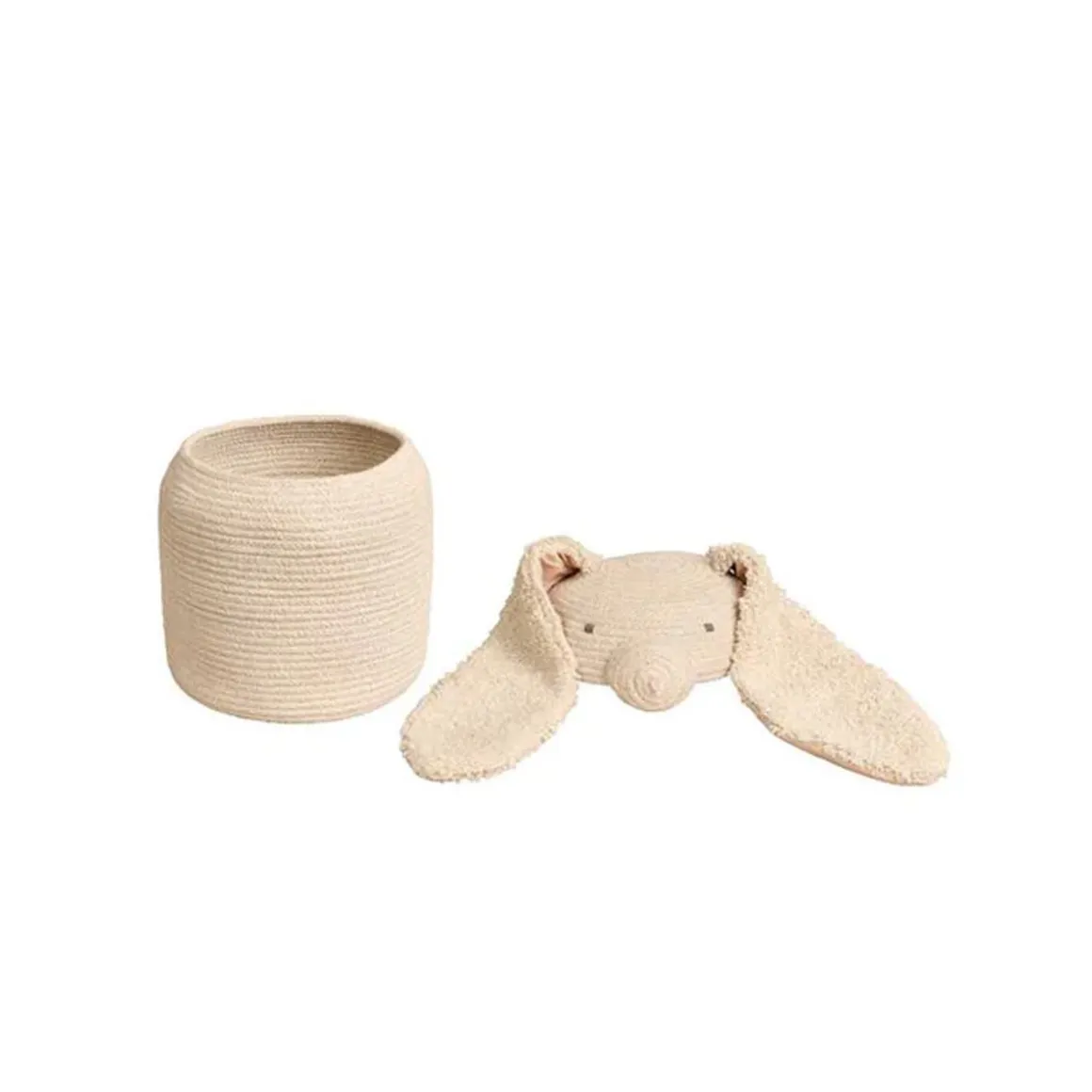 An oval-shaped bunny basket in natural color, handcrafted using braided cords made of fibers from recycled PET-bottles mixed with cotton. With extra long soft tufted ears and a rounded nose, the Rita the Rabbit basket is finished with a big cotton pompom as a tail.
