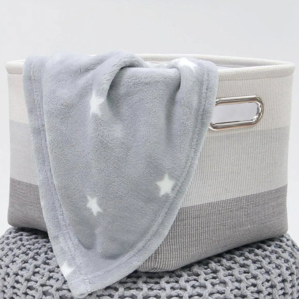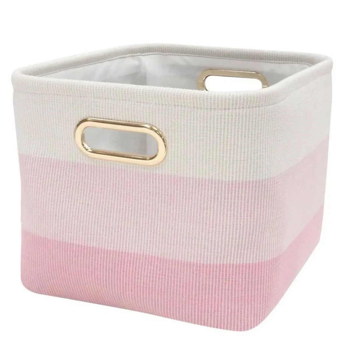 This sturdy storage basket is the perfect addition to your stylish nursery or playroom. Has a polyester lining. There are two built in gold handles for easy carrying.