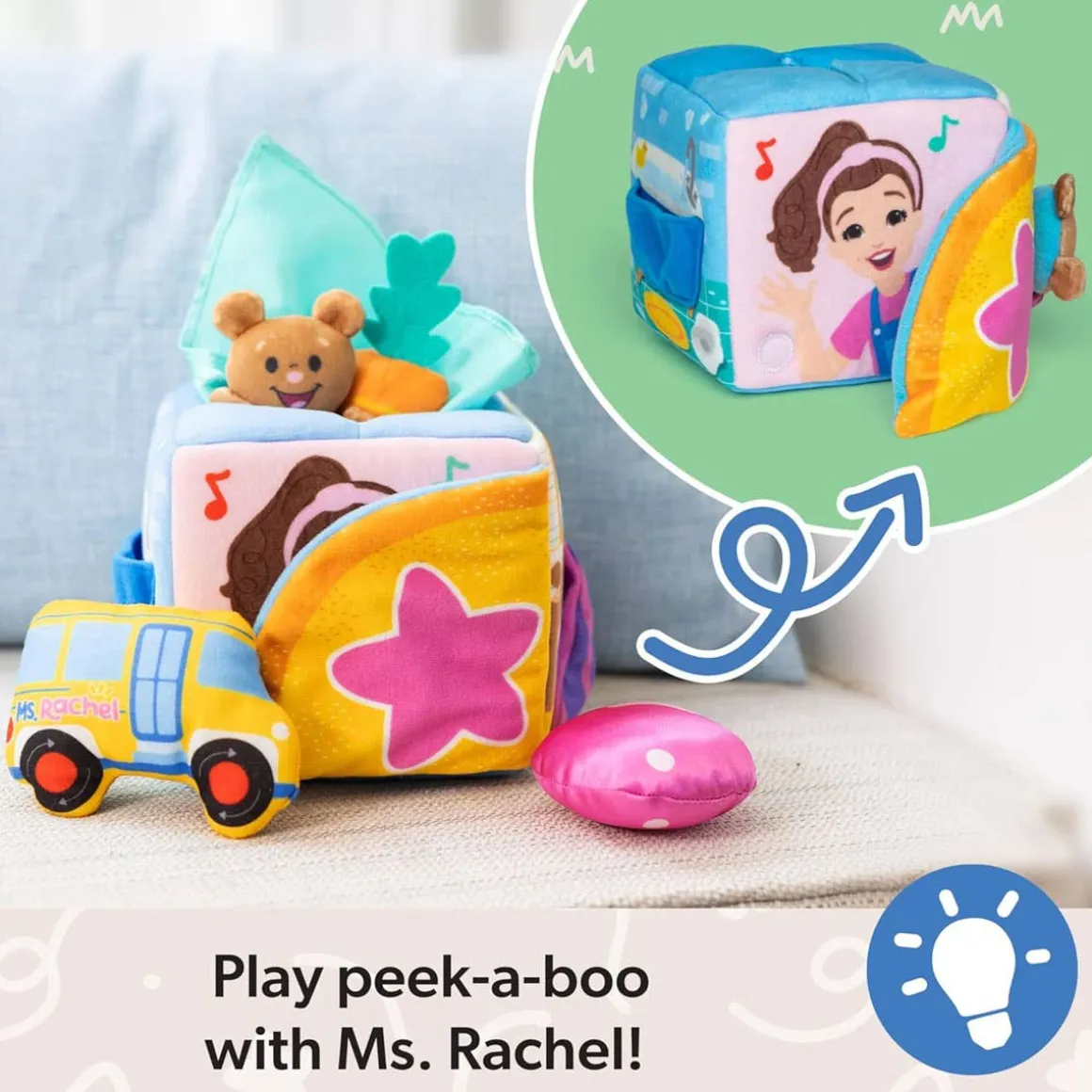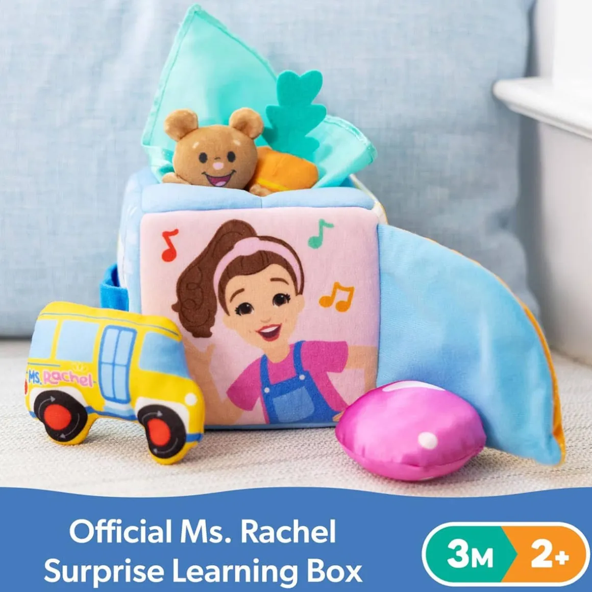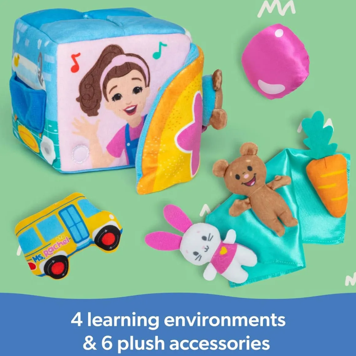 - OFFICIAL MS. RACHEL SENSORY TOYS: Interactive “Surprise Box” with 4 learning environments and 6 plush accessories (teddy bear stuffed animal, bunny, bus, scarf, plush carrot and bubble gum) for sensory fun.