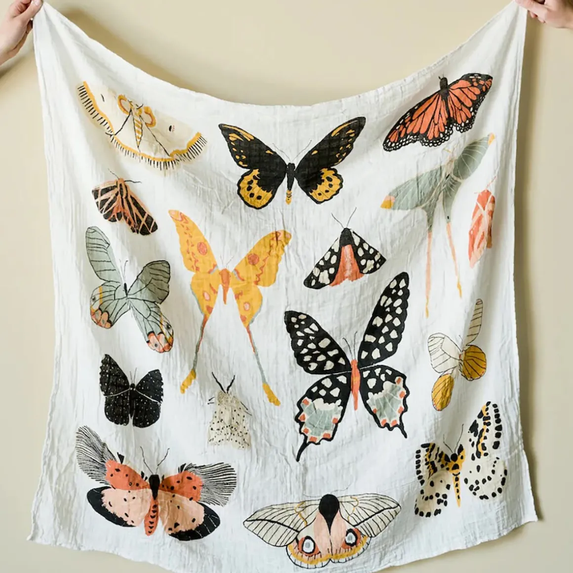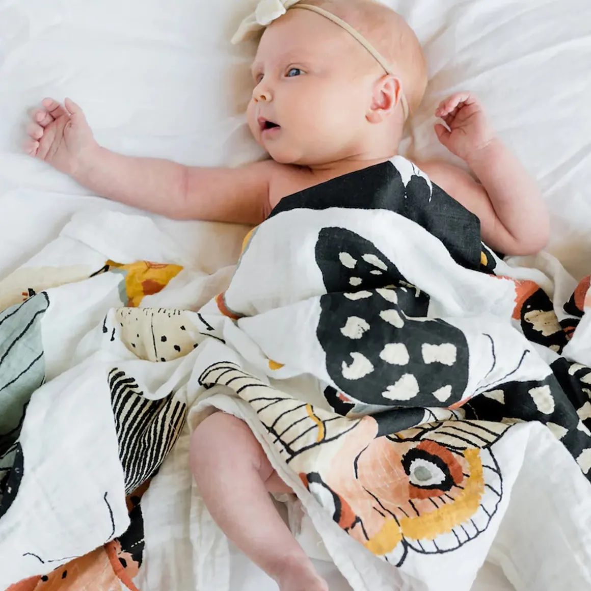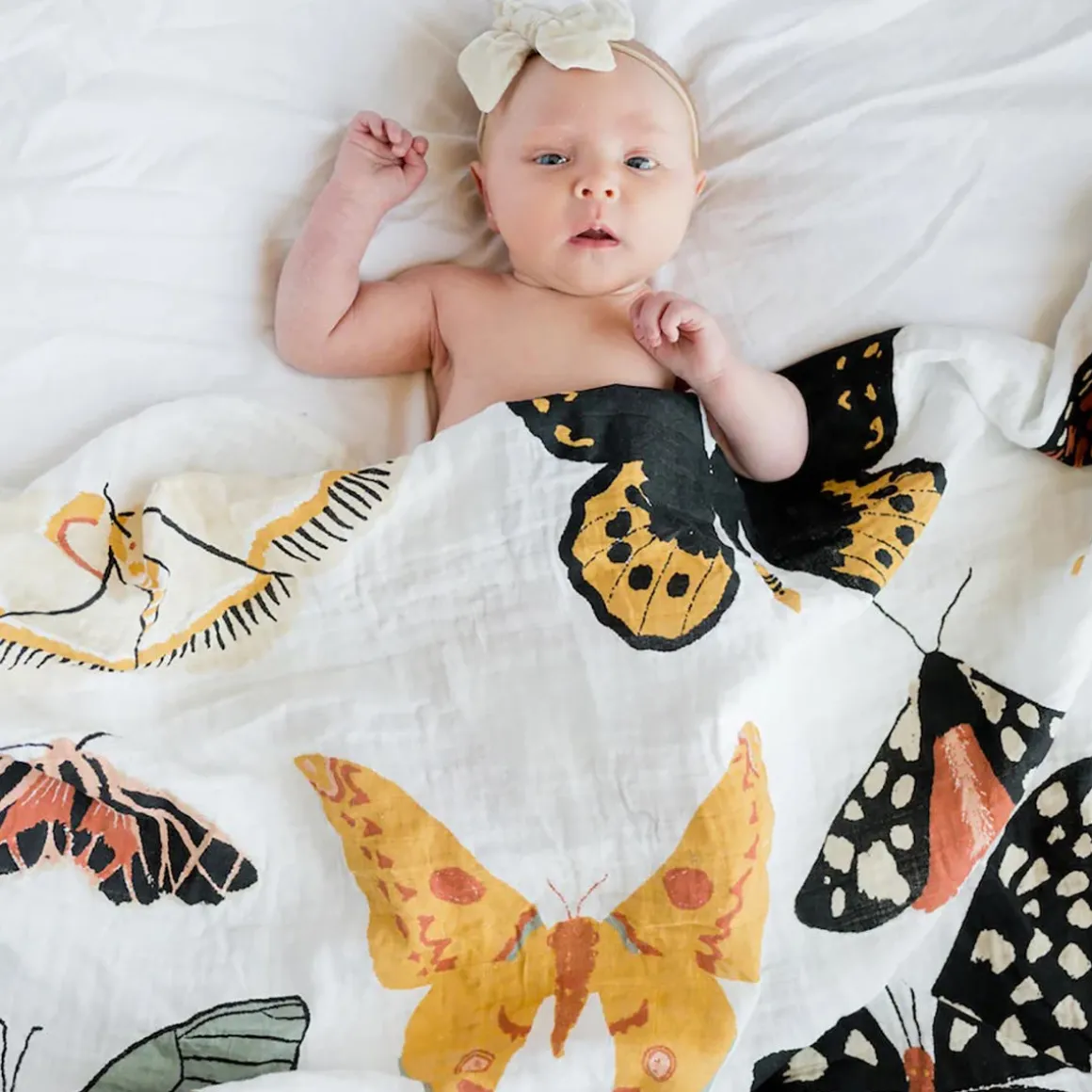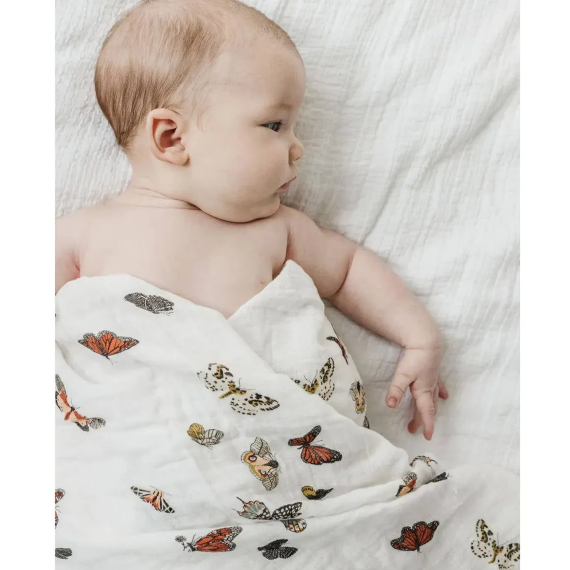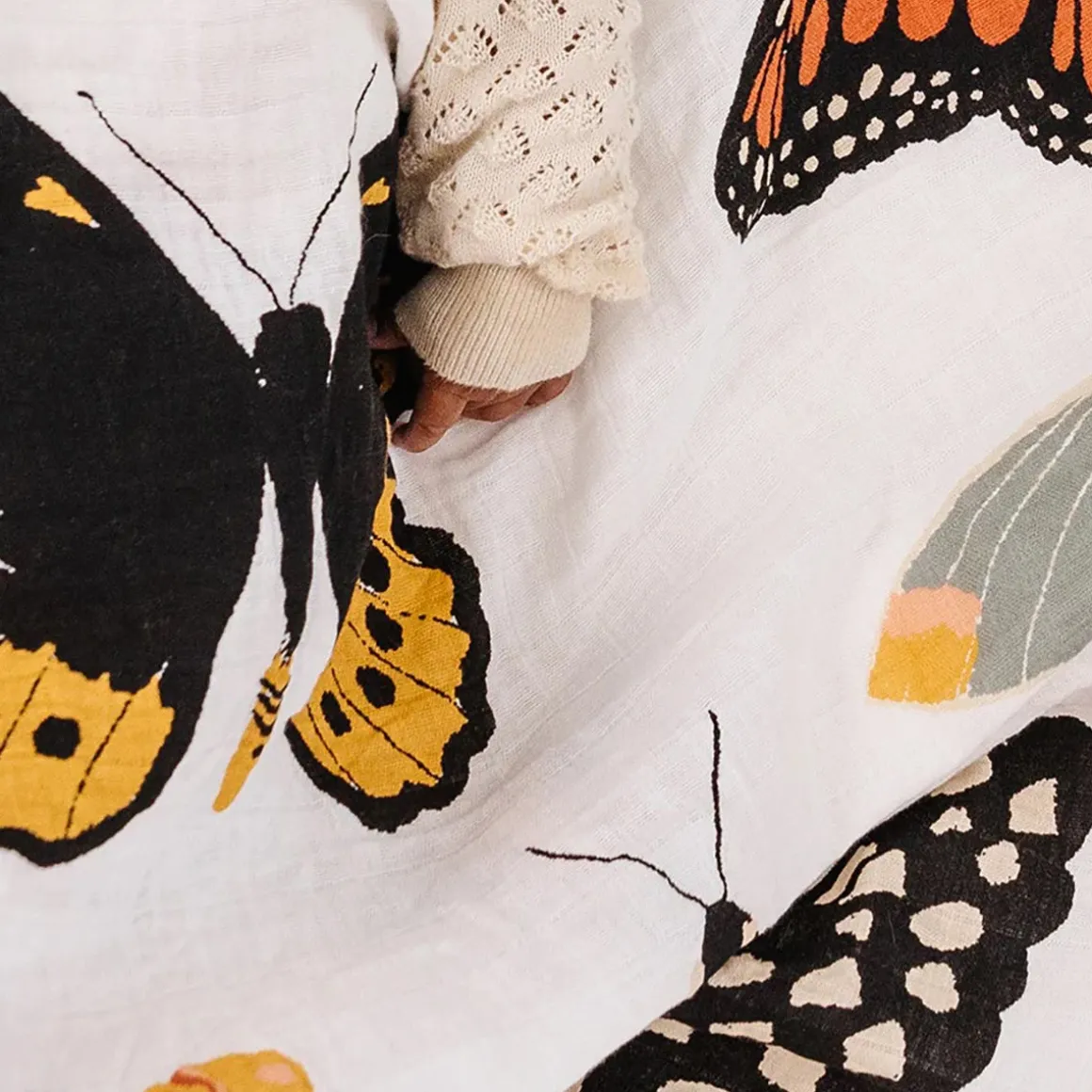 Made of 100% cotton muslin, and only gets softer with time. Butterfly in the skyyyy, I can go twice as high. Take a look, this Butterfly Migration Swaddle has our hearts all a flutter. A golden sun setting over the mountains. ☀️