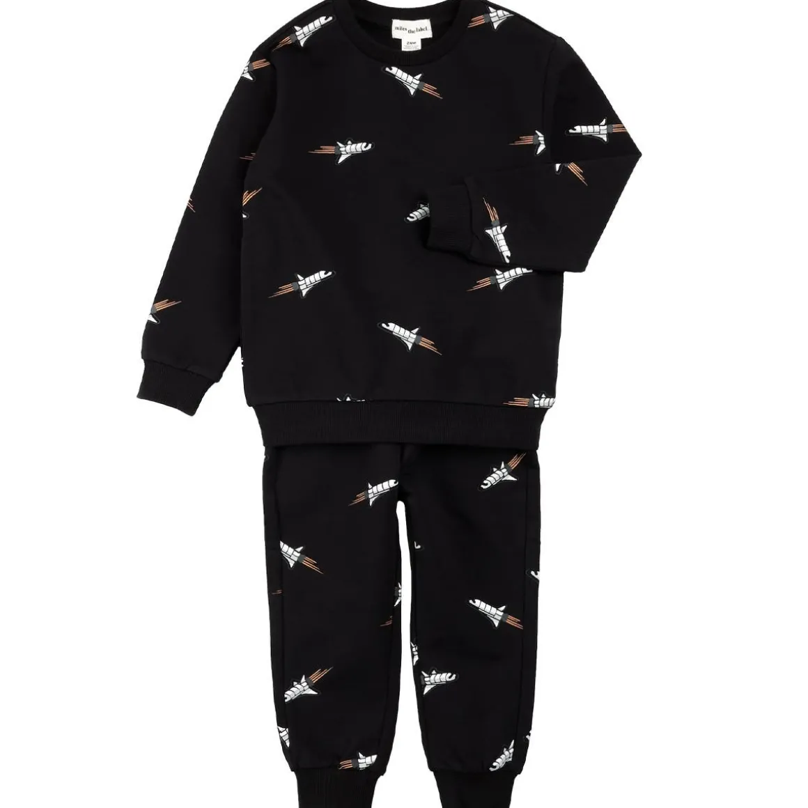 This black jogger set features our all over Rocket Ship print that will have them zooming to the moon even during the day. Perfect for little boys with their heads in space, the jogger set is made from organically grown cotton French terry, giving them the flexibility they need while they whizz around the house. Easy dressing features like the rounded neckline and elasticated waistband ensure the set is comfortable for all-day wear and easy to pull on or off little boys always on the move.