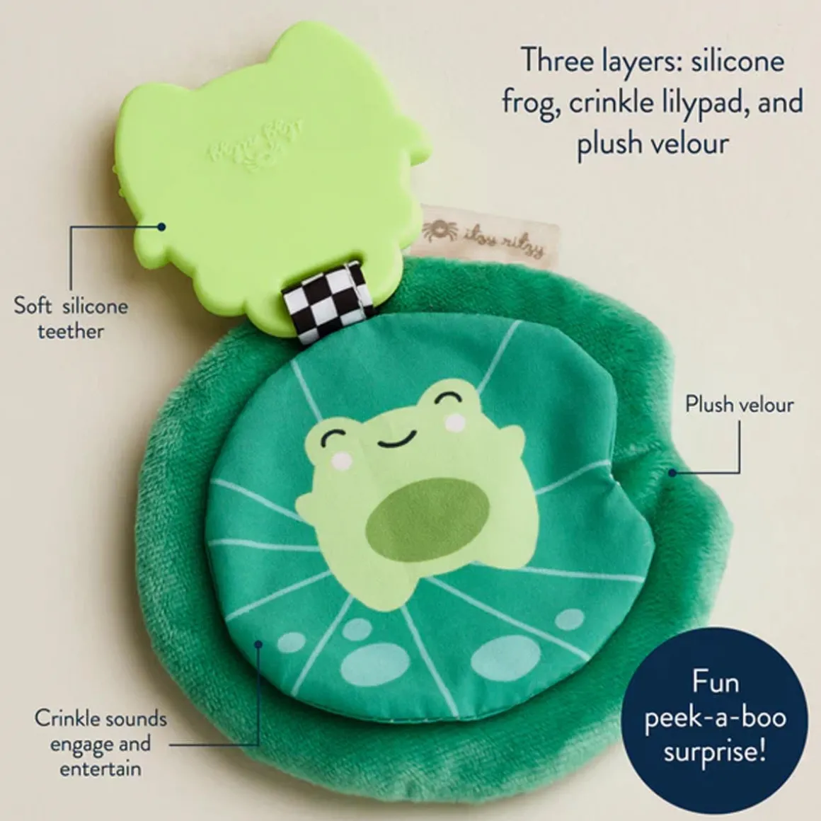 Get ready for double the fun with the Sweetie Crinkle™! This adorable essential combines a soothing silicone teether with soft plush and crinkle sounds. It is sure to delight your little one’s senses!
