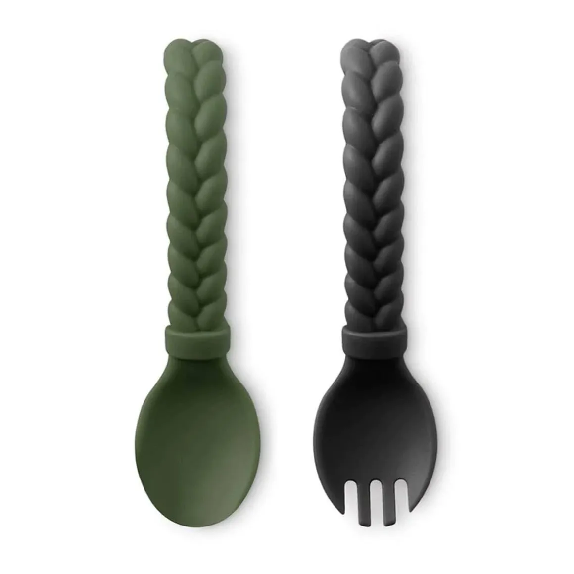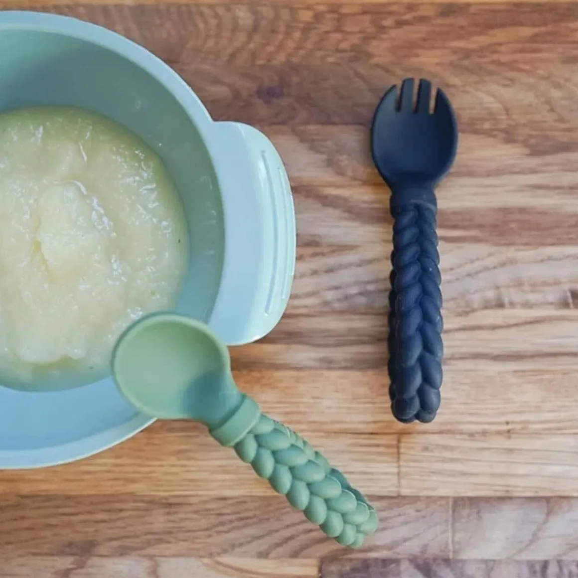 Add some style to mealtime with Itzy Ritzy adorable silicone baby utensil set! The Sweetie Spoon design has a looped handle that is easy for baby to pick up with their small hands, complete with a braided pattern that adds texture. Made entirely of food grade silicone, Sweetie Spoons are gentle in baby’s mouth and are intended for ages 6 months and up. This spoon and fork set is perfect for helping your little one on their journey towards self-feeding.