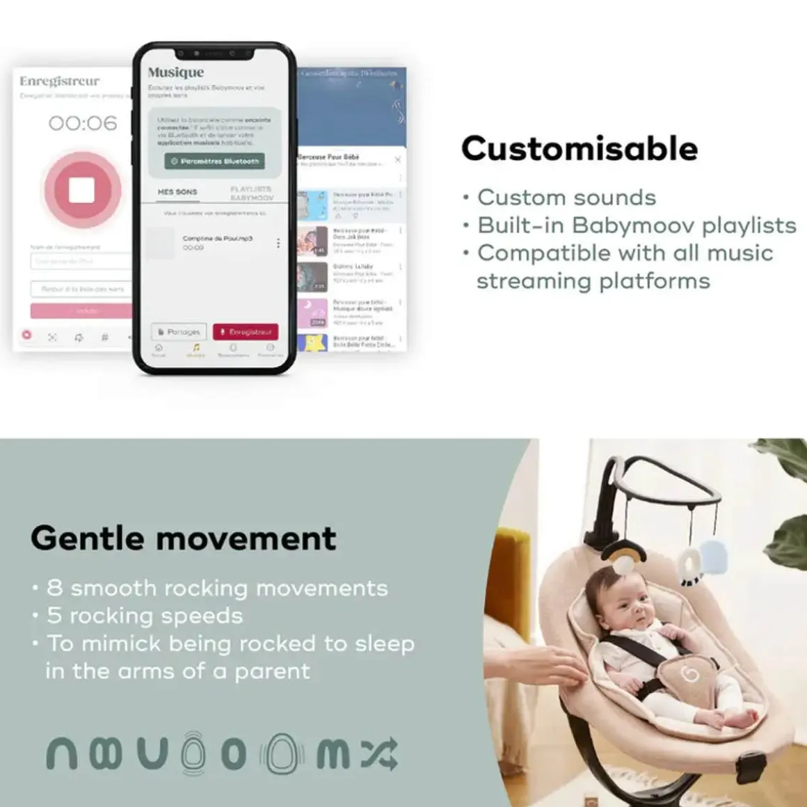 - Personalized Sound Options: Record custom sounds from parents, family, or friends, or stream music from your favorite platforms. Or enjoy one of the 12 built-in tunes (melodies, white noise, and nature sounds) plus exclusive Babymoov playlists.