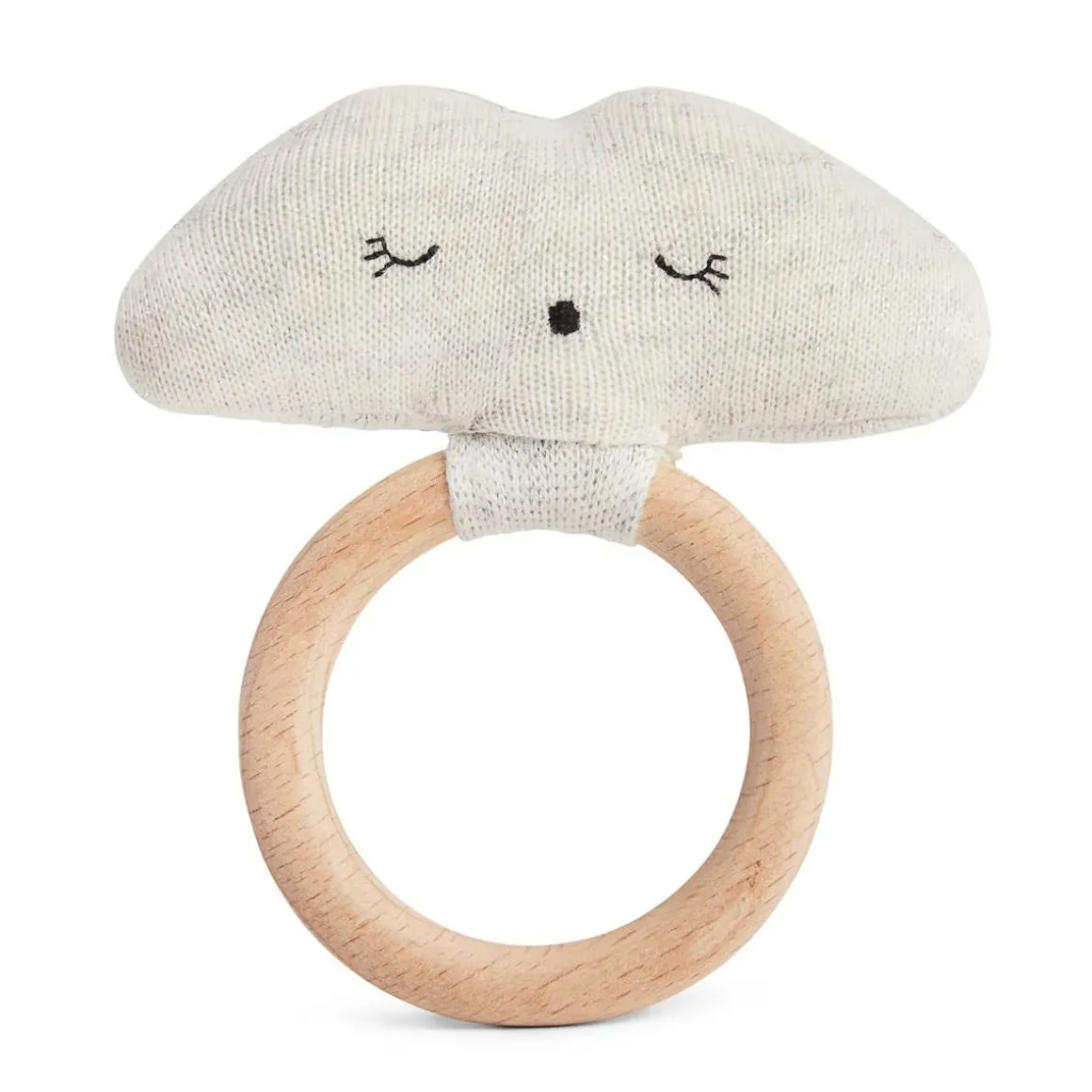 Made from knitted cotton with a silver sparkle, this sweet little blowing cloud makes a lovely toy for little hands to play with. The smooth natural wooden ring will satisfy your little one’s need to gnaw down when those teeth are moving, and the rattle inside give this a fun, interactive element.